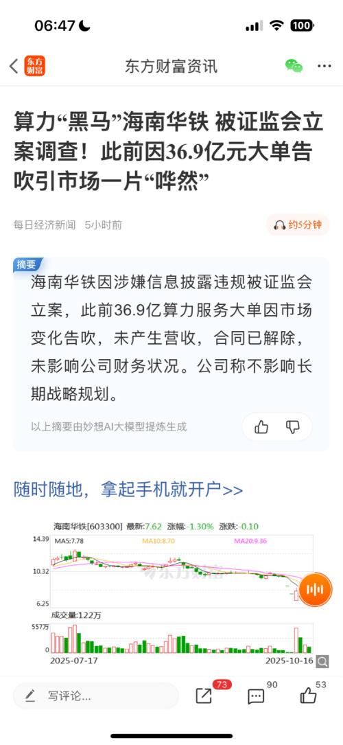 算力“黑马”海南华铁 被证监会立案调查!此前因36.9亿元大单告吹引市场一片“哗然”