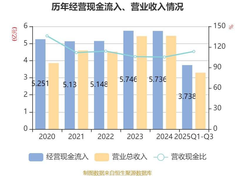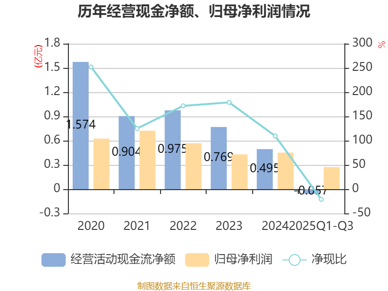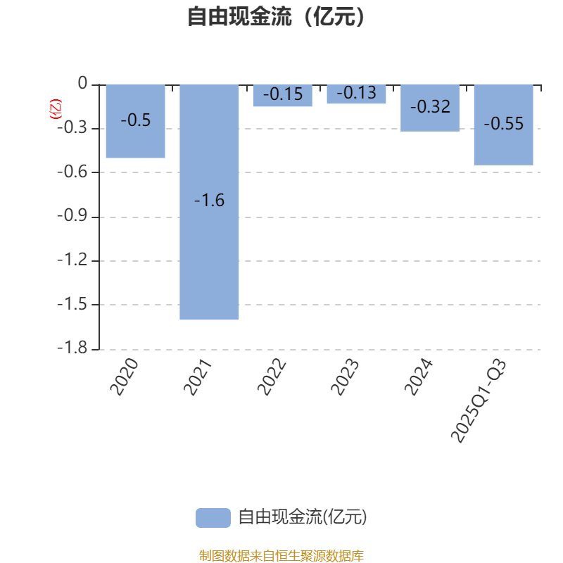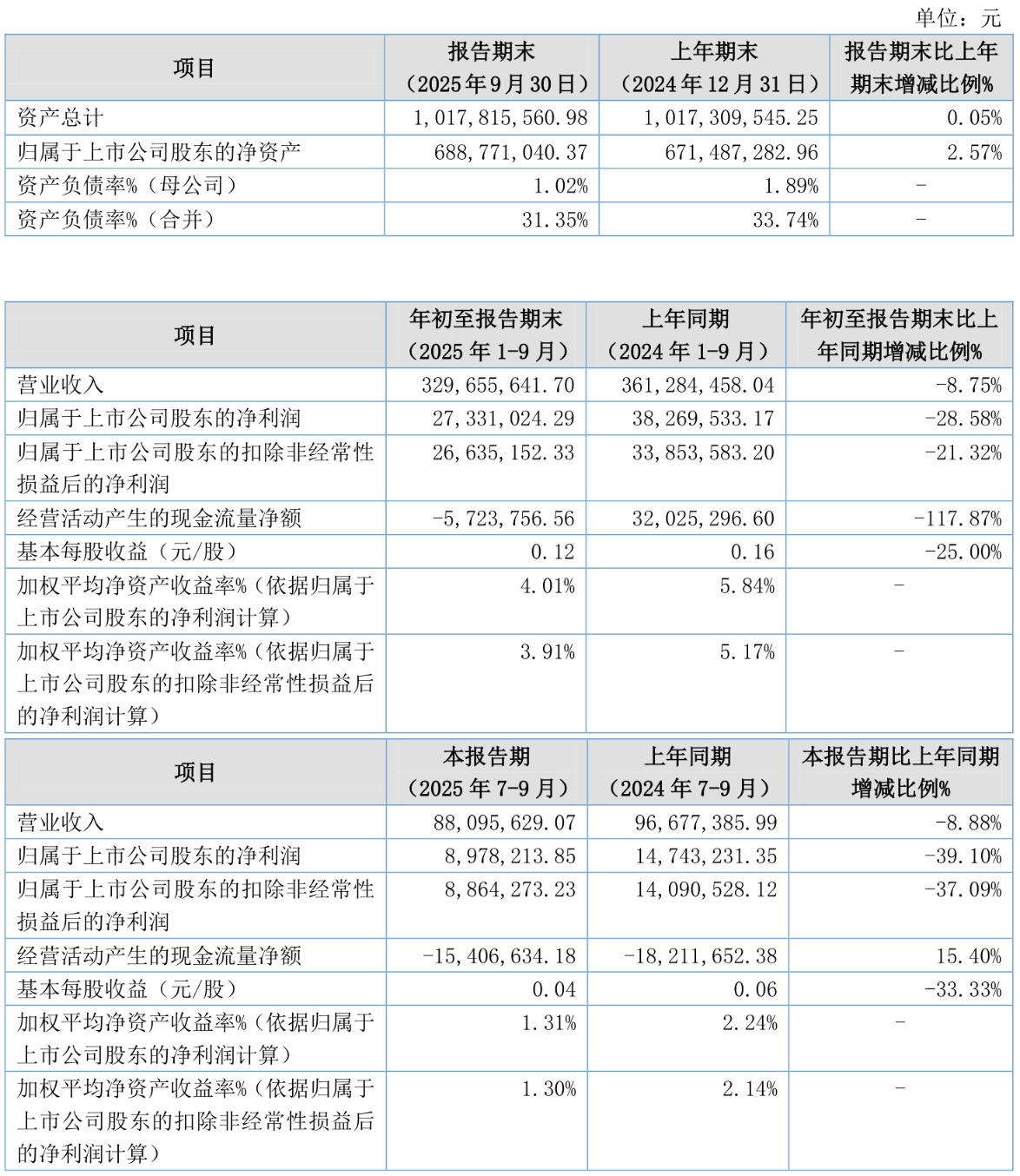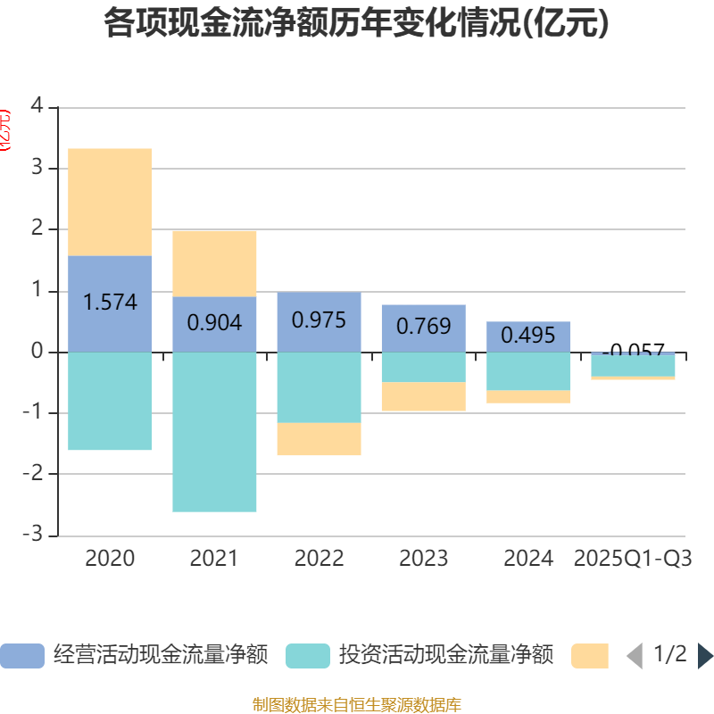 2025年前三季度,公司经营活动现金流净额为-572.38万元,同比减少3774.91万元;筹资活动现金流净额-531.4万元,同比增加1952.39万元;投资活动现金流净额-3449.28万元,上年同期为-8623.21万元。