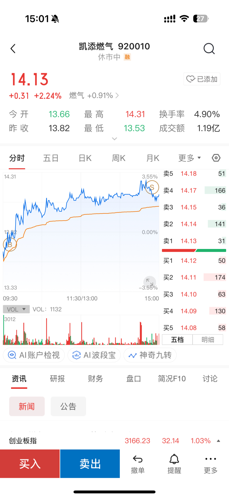 $凯添燃气(SZ920010)$ 卖出四分一,明天继续T!稳定盈利!!!谢谢凯添!我爱你!!!