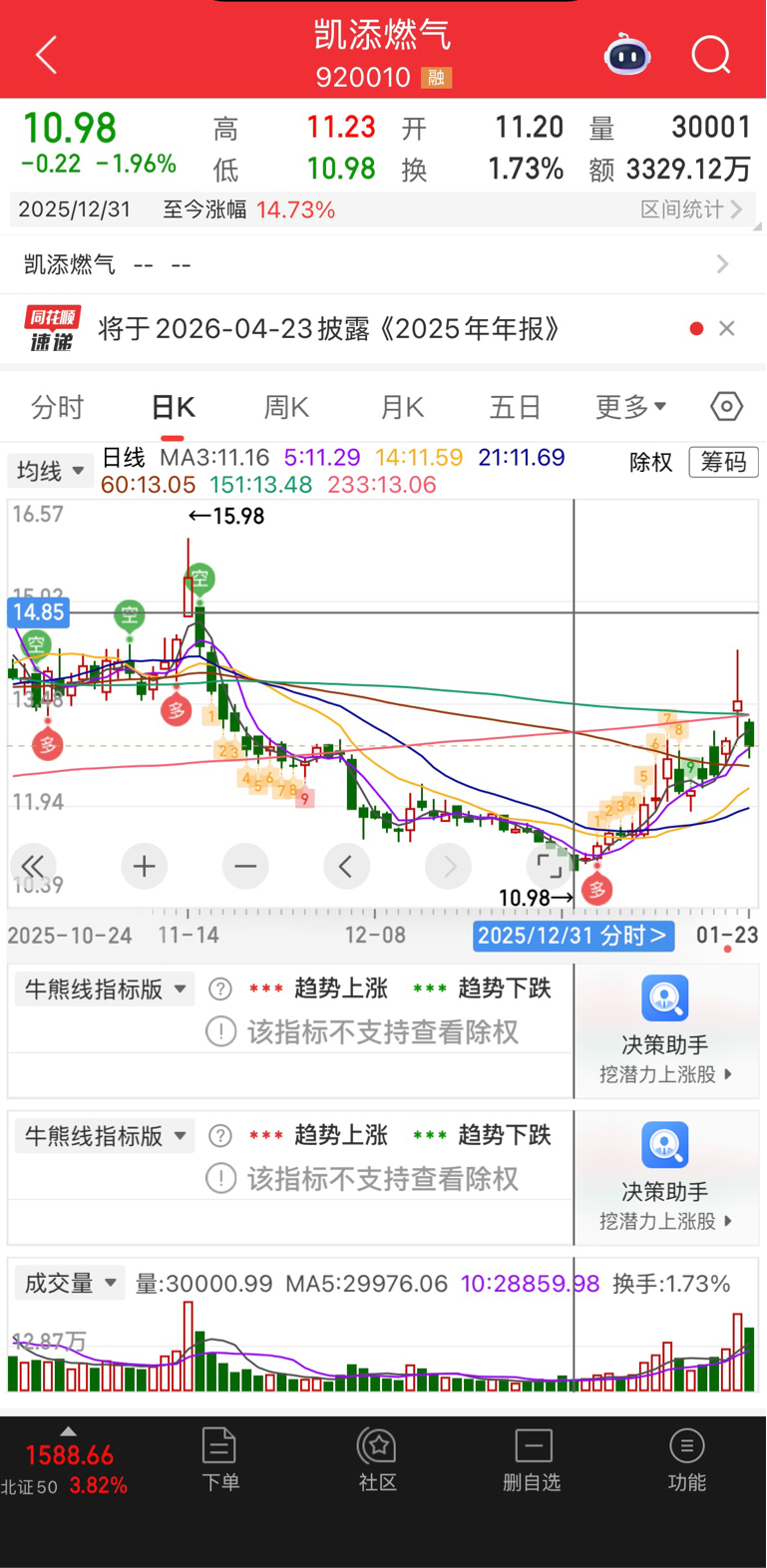 $凯添燃气(SZ920010)$ 去年最后一天低点收盘价10.98,到上周四14.3这个高度,其实已经反弹了接近30%。该调整了。这一波反弹,其实是跟风$北证50(SZ899050)$ 的反弹、$特瑞斯(SZ920014)$ 美国天然气期货暴涨的逻辑一定要理解。