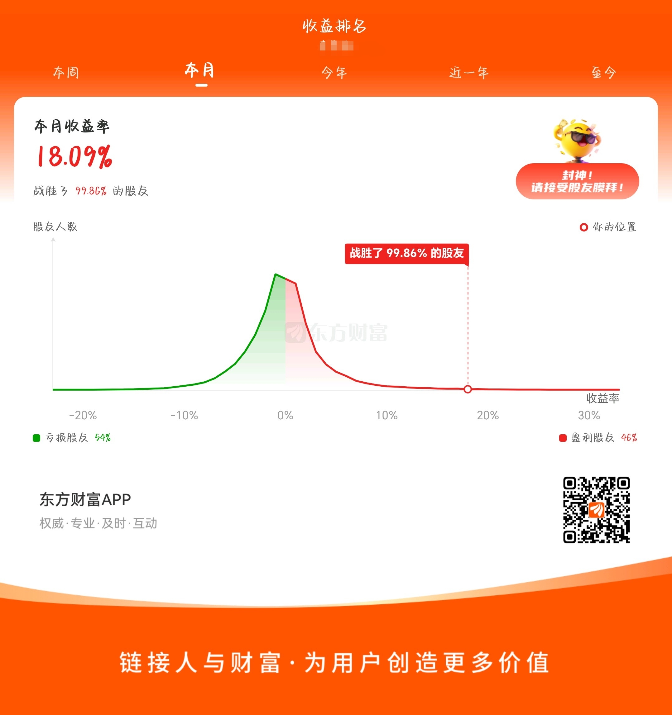 $锦华新材(SZ920015)$ $大众公用(SH600635)$ $山子高科(SZ000981)$ 十月前三个交易日我打败了99.99%的网友,因为那时我一直持有“大众公用”,还有一点山子高科,大众公用第二波几乎完美吃到,而且中间成功做了T,山子是国庆一回来就清了,尽管我感觉还能涨,但不去吃鱼尾,果然今天又涨停,实在强,后面涨跌已经与我无关…