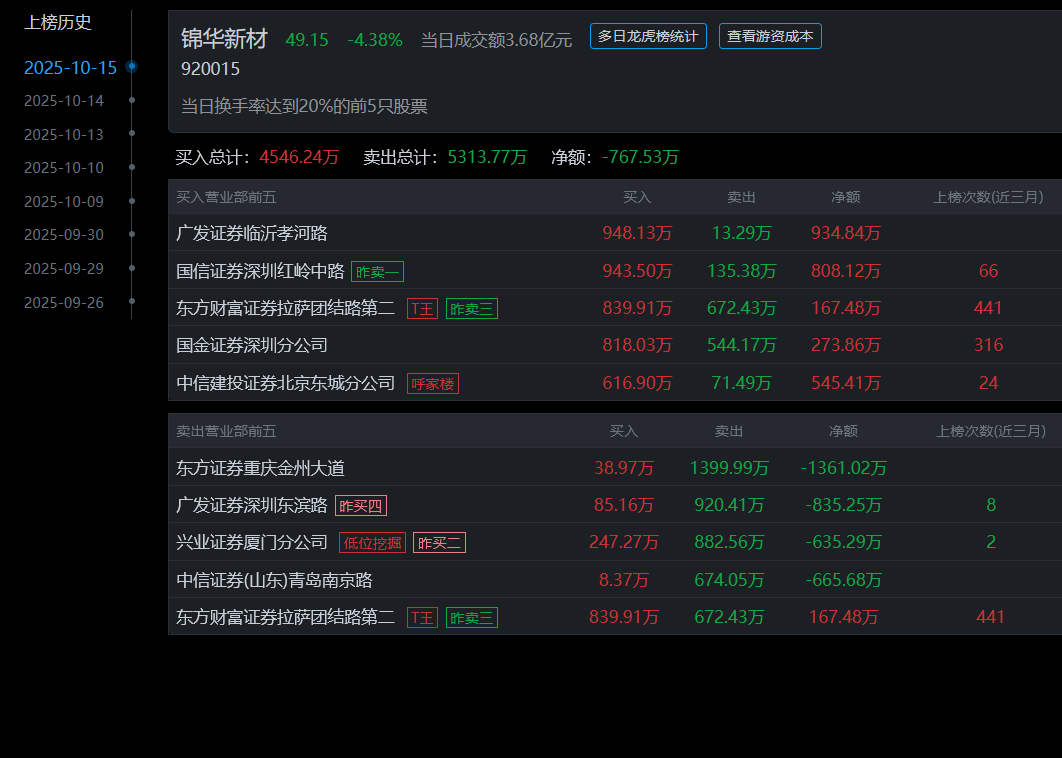 锦华新材今日游资龙虎榜席位上榜数据如下!