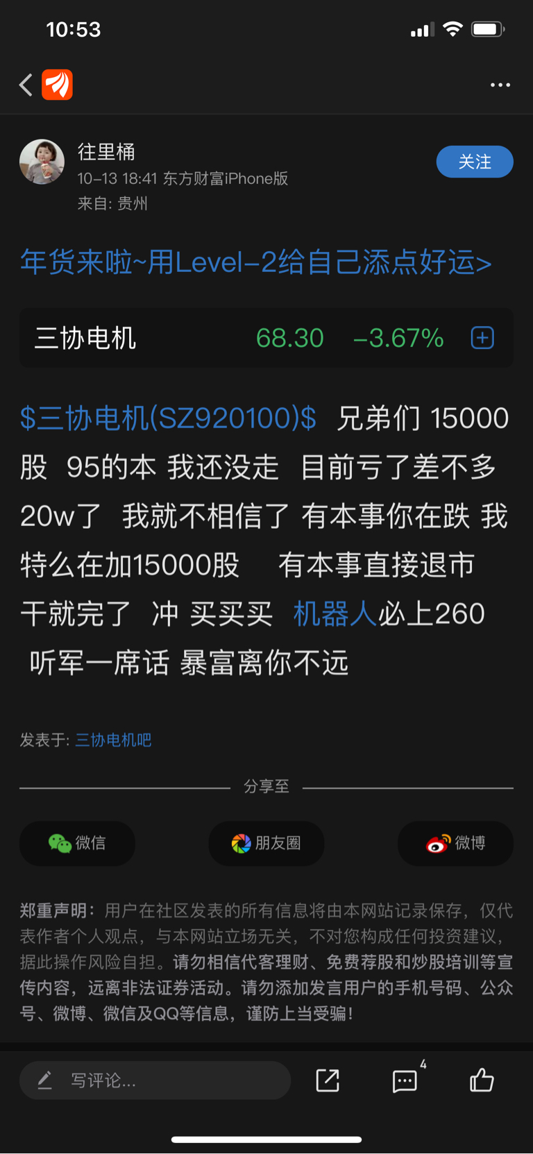 温馨提示: 1.根据《证券法》规定,禁止编造、传播虚假信息或者误导性信息,扰乱证券市场;2.用户在本社区发表的所有资料、言论等仅代表个人观点,与本网站立场无关,不对您构成任何投资建议。用户应基于自己的独立判断,自行决定证券投资并承担相应风险。《东方财富社区管理规定》