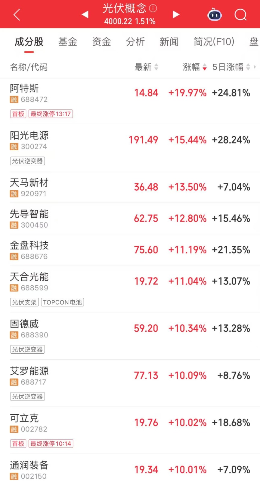 今日,新能源赛道表现亮眼。午后,光伏、储能产业链集体走强,截至收盘,阿特斯、通润装备、隆基绿能、通威股份、晶澳科技等多只龙头股集体涨停。