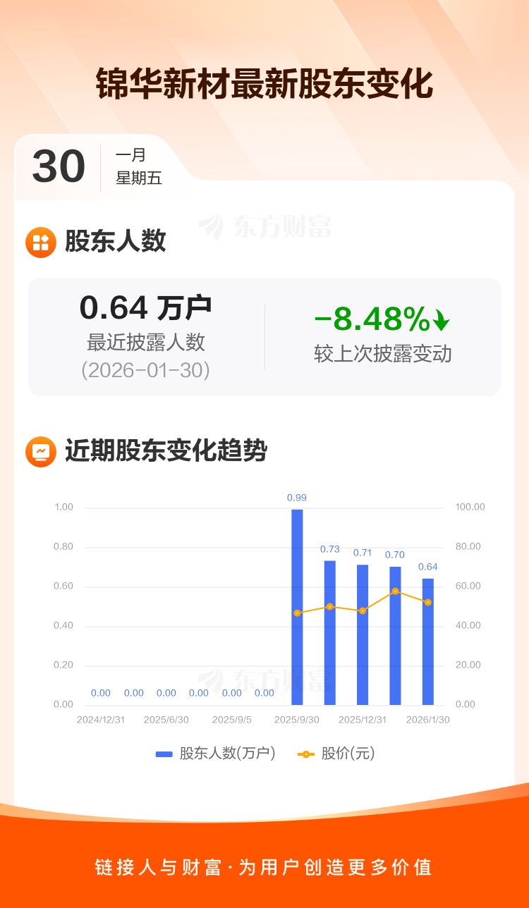 锦华新材:截至1月30日最新股东户数6422户,较上期减少8.48%