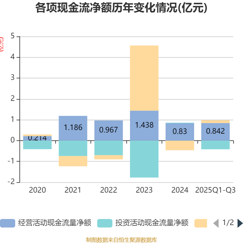 2025年前三季度,公司经营活动现金流净额为8418.01万元,同比下降16.05%;筹资活动现金流净额1350.14万元,同比增加4710.5万元;投资活动现金流净额-4171.24万元,上年同期为-1.87亿元。