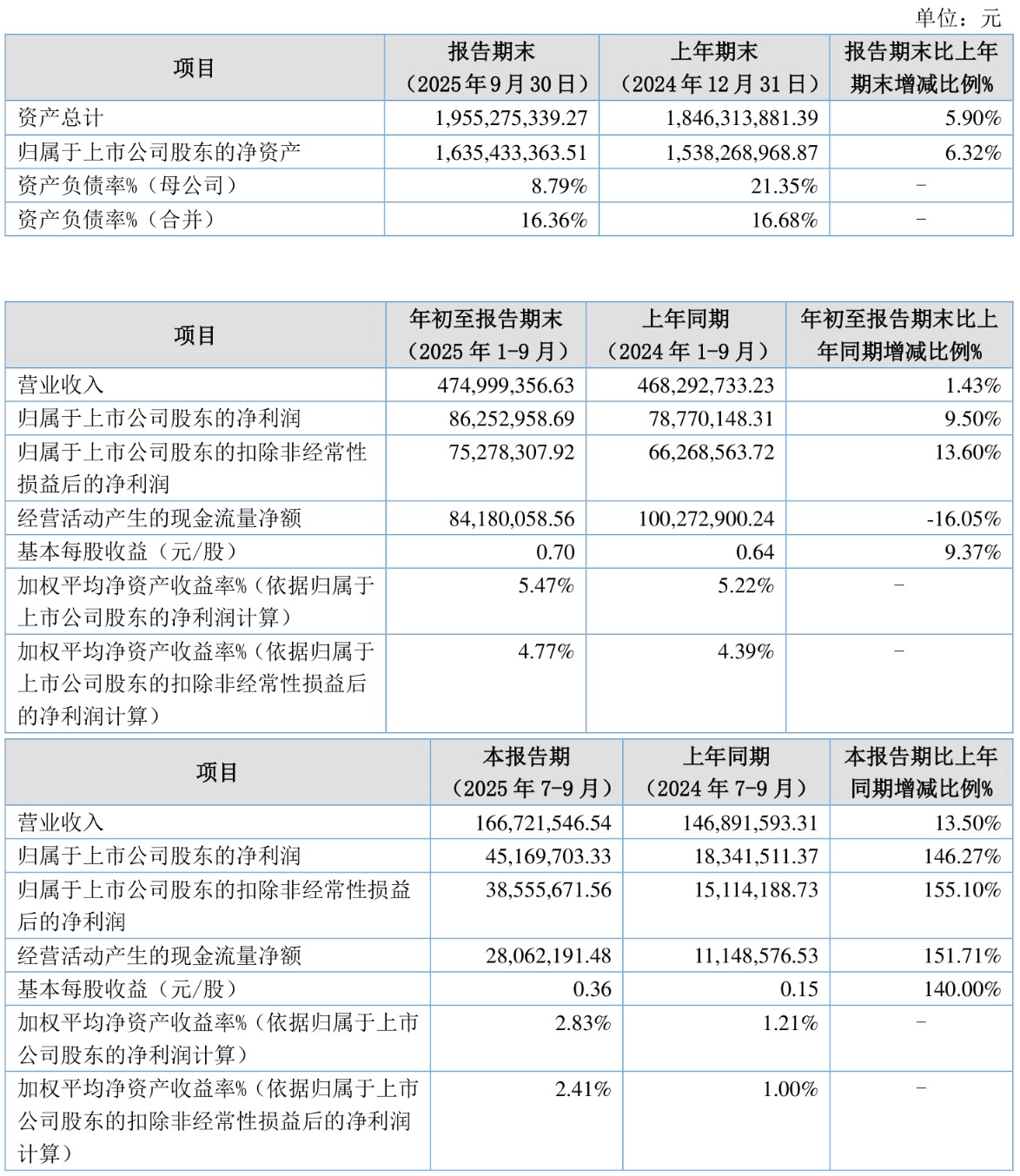 负债重大变化方面,截至2025年三季度末,公司应付票据及应付账款较上年末增加54.9%,占公司总资产比重上升1.26个百分点;长期递延收益较上年末减少13.27%,占公司总资产比重下降1个百分点;合同负债较上年末减少14.65%,占公司总资产比重下降0.36个百分点;应付职工薪酬较上年末减少46.62%,占公司总资产比重下降0.32个百分点。