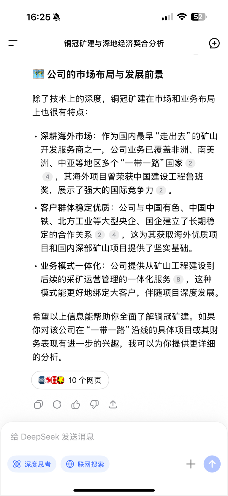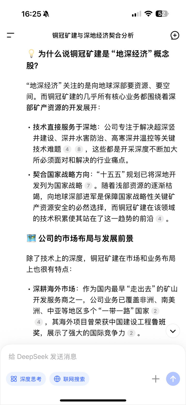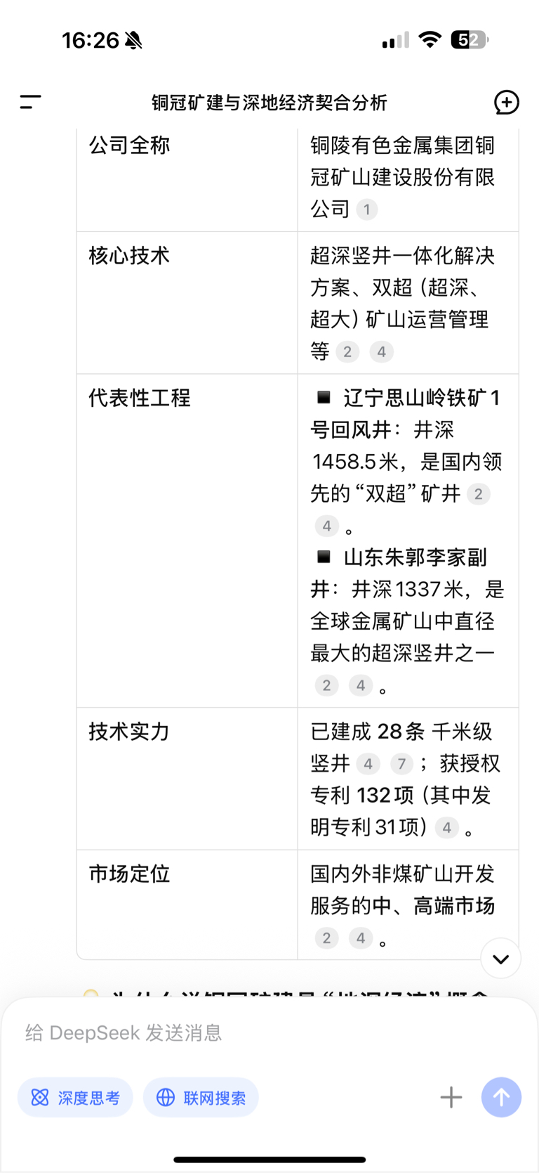 $铜冠矿建(SZ920019)$ 我学习了很多,铜冠矿建是正宗的深地经济龙头股,全球挖矿,而且挖的直径大,深度给力!这个题材符合十五五规划,上面也扶持我国这种企业走出国外,在国际市场上拥有竞争力!同学们,拿好了,底部位置使劲儿买就对了。一定要有耐心,等待后知后觉的人进来!