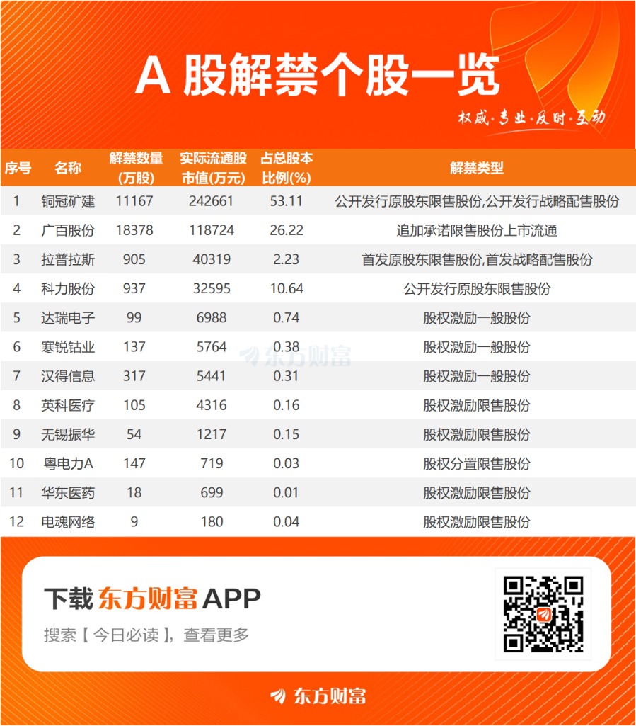 【明日解禁】明日12股解禁 铜冠矿建、广百股份解禁市值居前
