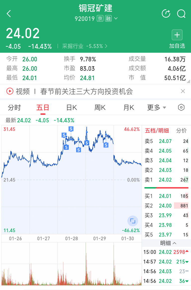 $铜冠矿建(SZ920019)$ 31.45,历史大顶,周一观赏-30cm的瀑布
