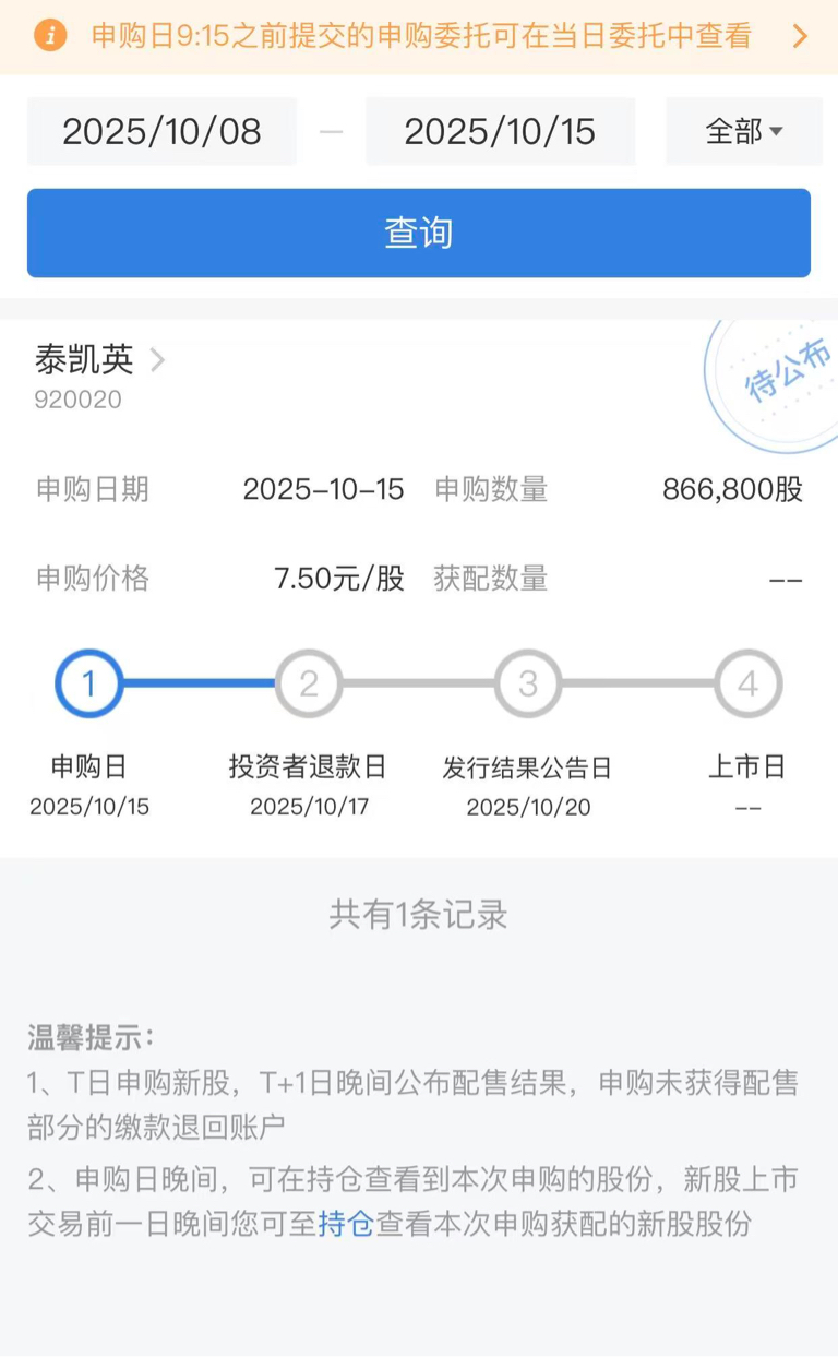 $泰凯英(SZ920020)$ 个人申购记录:申购650.1万元(86.68万股),基本确定3+1。加足了安全垫,估计浪费小50万,无所谓啦,图个踏实。明天下午第一时间发结果~
