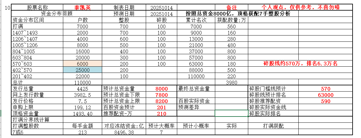 $泰凯英(SZ920020)$ 根据综合分析,目前预测泰凯英的申购资金总量为8000亿左右,范围为7800-8200。测算的结果见附图。个人观点,百股需要资金201万元,建议210万配资;碎股计算难度大,风险高,测算后,个人观点是在顶格申购7+1的情况下,碎股线为570万,排名为6.3万名,推荐按照590万配资。资金预测8000亿,在锦华8500的基础上,上限降低预计降低500亿,下限降低增加100亿,自然增加100-200亿,REITs分流200-300亿。另外,现在由于聪明资金增多,碎股减少,散户多次陪跑后也变聪明,要么拿出大资金要么退出,贡献的碎股都减少,加上碎股需要卡位需要抢排名,所以500-600万附近现在密度很大,所以股友们需要尽量避开这个区域,也尽量不要分户到这个区域去抢2+1的碎股,预测碎股线影响的因素太多,之前预测的9轮,有三轮碎股预测失败,所以翻车概率较大,特别是这种顶格有很多档的(若是顶格整股只有1~3的预测要相对容易一些)。个人预测,仅供参考。有实力的还是需要多加,增加安全系数,我们需要安全上岸,而不是精准踩线!资金实力不允许的,在分界线附近的,自己尽力了就好!现在很卷,没有绝对的安全,只有概率高低,预测翻车也是正常的。不喜勿喷,口下留德,谢谢! 另外,本人在论坛原则上不帮忙分户或指导分户,很抱歉!