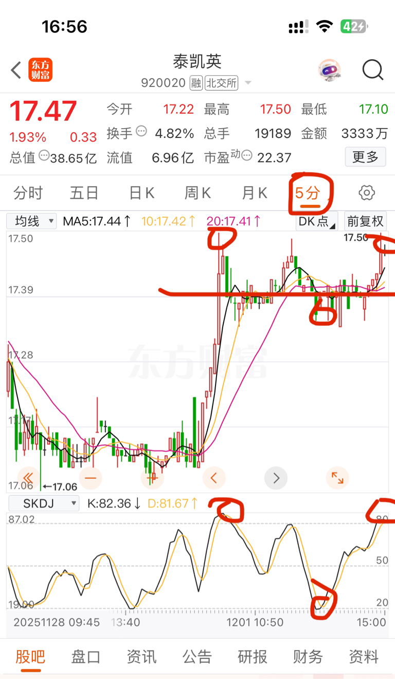 $泰凯英(SZ920020)$ 上5日均线17.3,收10日均线17.47,分时短线调整完成,筹码在5-10日均线处堆积。说会再跌的可以早点睡觉了。炒股别说大挣打板,如果连反弹的几个点都吃不到活该被割。没事自己看5-15-30-60-120分时和日线macd,kdj,skdj后再来。