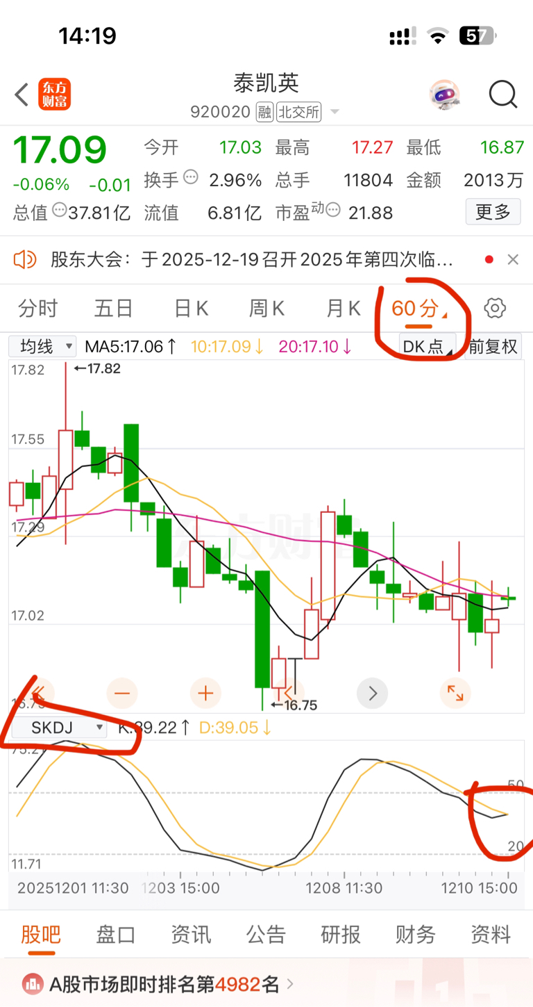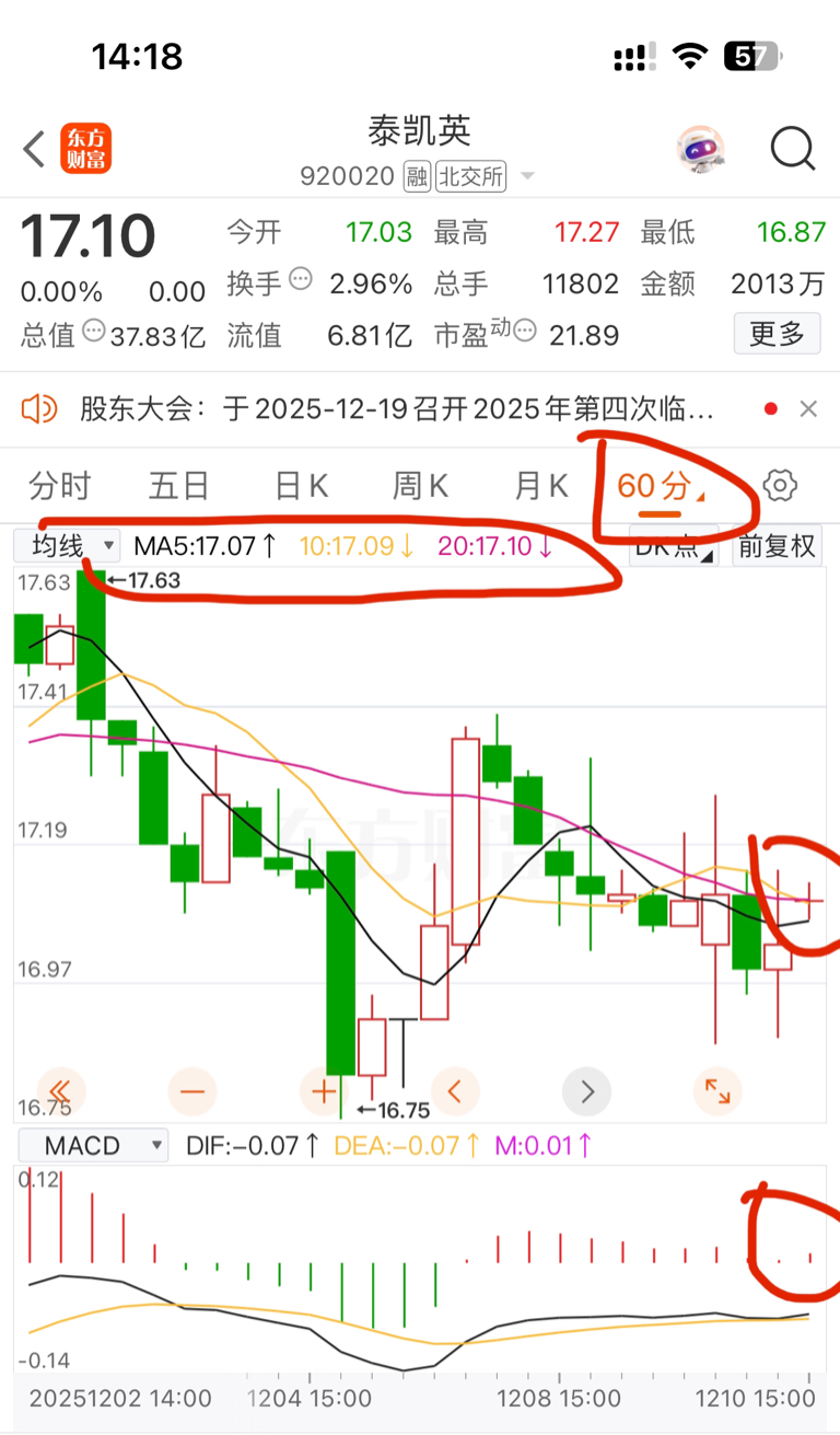 $泰凯英(SZ920020)$ 60分时17.07附近各均线粘合。这也是5日均线位置。并且分时调整即将完成macd,skdj60分时17.07附近金叉,而上周11.27-11.37是日线金叉。主力打压了3毛成本。筹码做在16.87-17.07处。所以我的建议今天17.14-17.02必须买入。明天就有可能上冲20日均线17.5上。