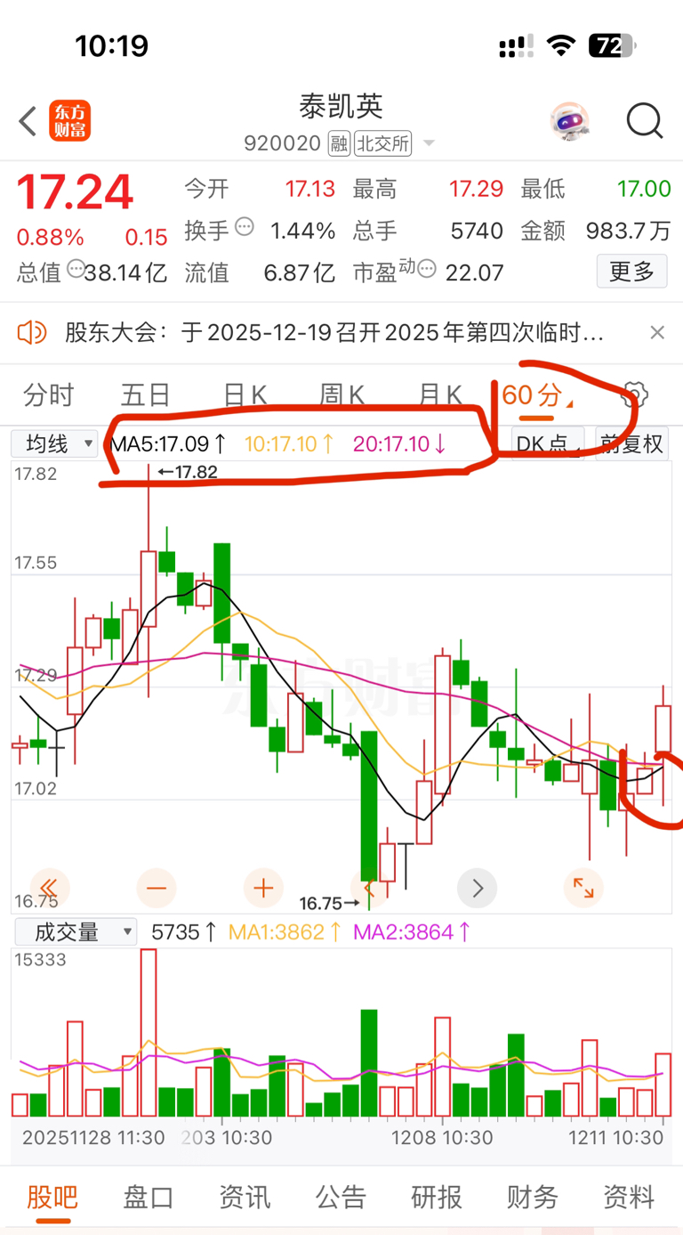 $泰凯英(SZ920020)$ 昨天怎么说的,60分时17.07附近均线粘合。让你们17.04-17.14买就对了。今天60分10:30前果然17.10粘合了吗(放量抬高3分了)是不是又挣了1个点
