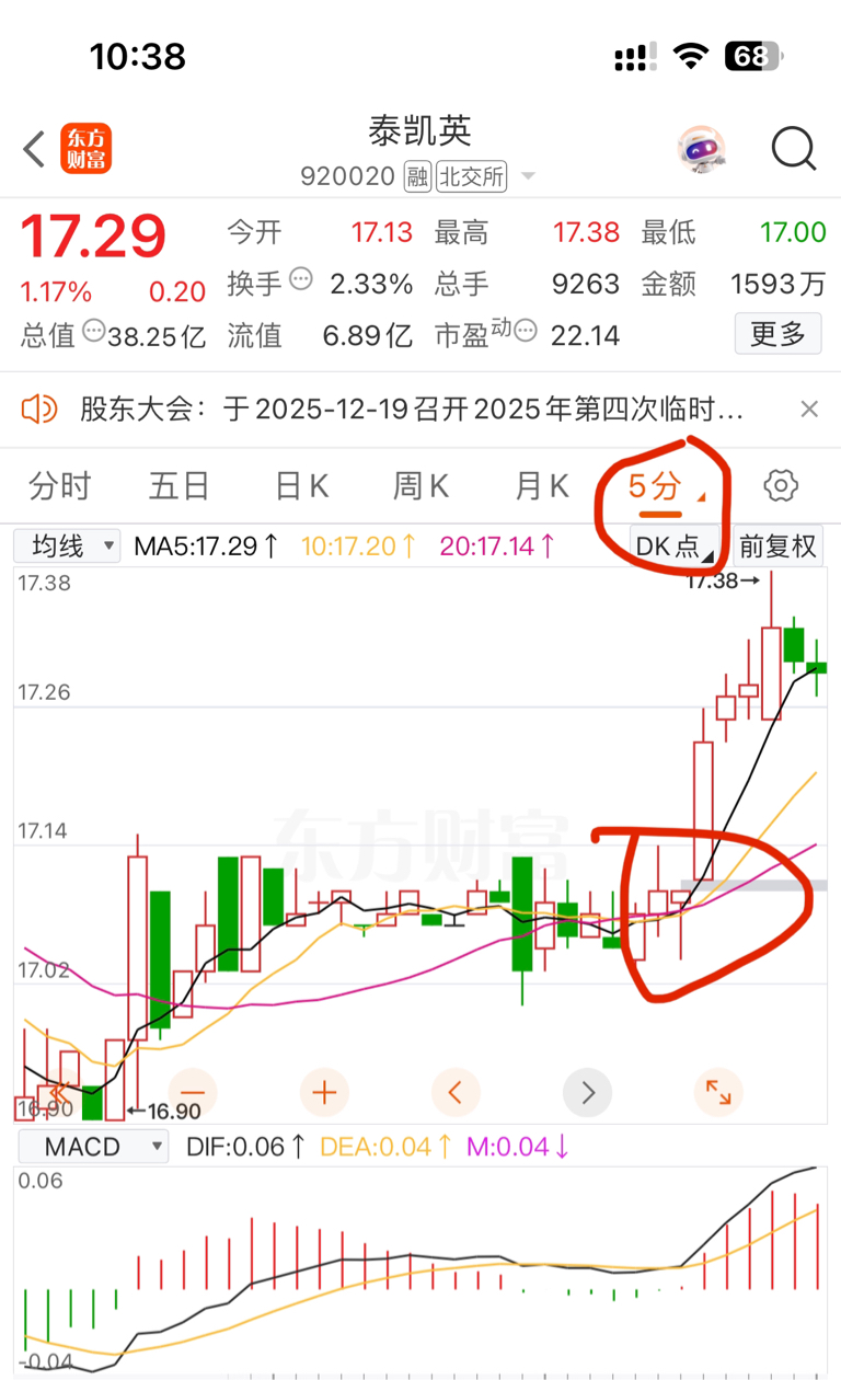 $泰凯英(SZ920020)$ 才发完贴就回拉回到17.27-17.37了。后面的准确目标是18.1-18.5补回这个缺口。从60分时看才17.10-17.17成本,所以不会拉太多,最多全天上探20日17.45-17.5附近这里。所以慢慢涨吧。确定了目标就行。今天买入位置17.14-17.27