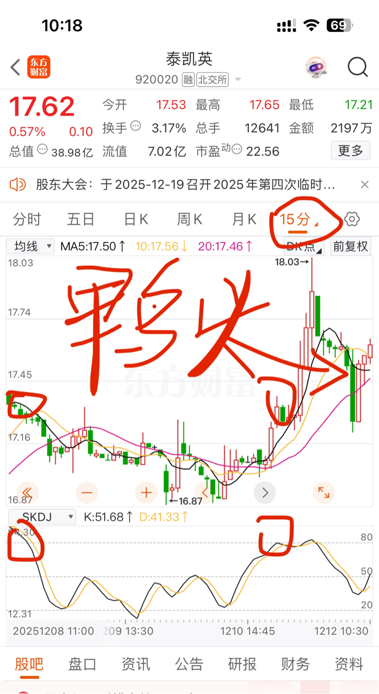 $泰凯英(SZ920020)$ 15分时的老鸭头,目标是再冲18补18.5缺口的。这二天放量和洗盘的做多筹码成本都在17.3上附近-17.6。盘小业绩支撑,大胆拿。涨的再小也是肉,亏死融资盘。