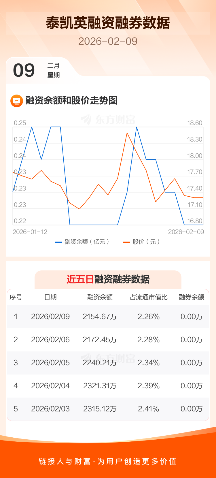 交易所最新数据显示,泰凯英于2026年2月9日获融资买入30.57万元,融资偿还48.35万元,当日融资净偿还17.78万元。目前,该股融资余额2154.67万,占流通市值比例为2.26%。
