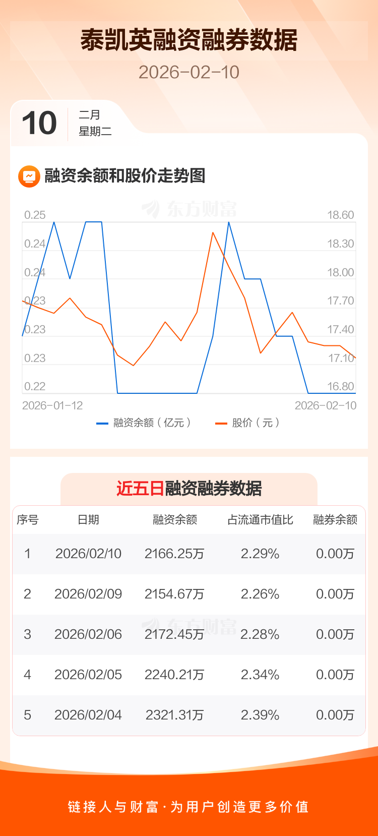 交易所最新数据显示,泰凯英于2026年2月10日获融资买入46.27万元,融资偿还34.68万元,当日融资净买入11.59万元。目前,该股融资余额2166.25万,占流通市值比例为2.29%。