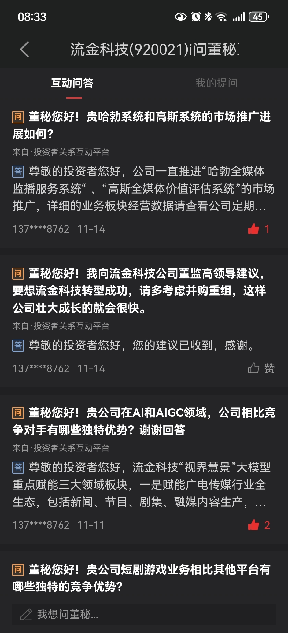 $流金科技(SZ920021)$ 加快重组,董秘回复的很快,很明确,接受了投资者建议。