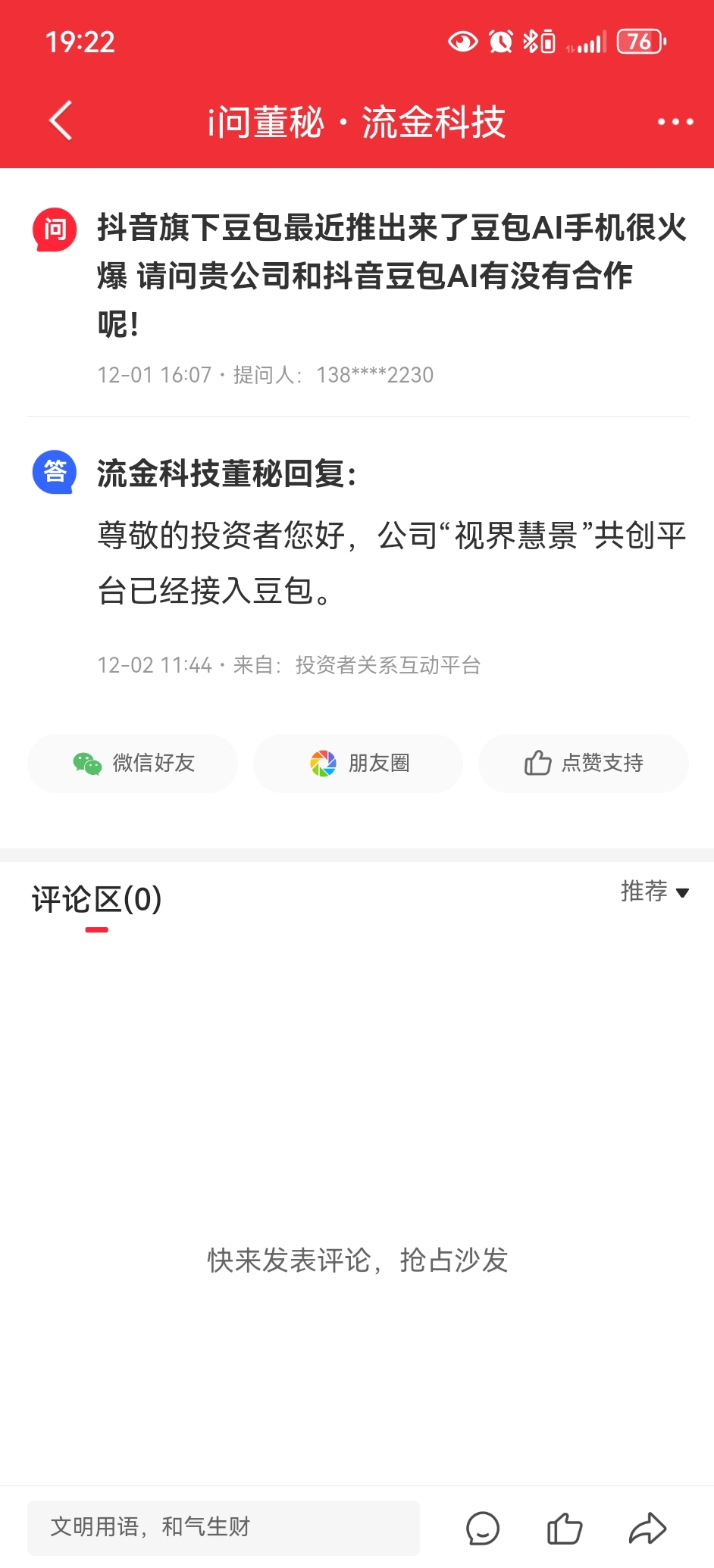 一起为流金科技添加“豆包”概念问贵公司和抖音豆包AI有没有合作呢!流金科技董秘回
