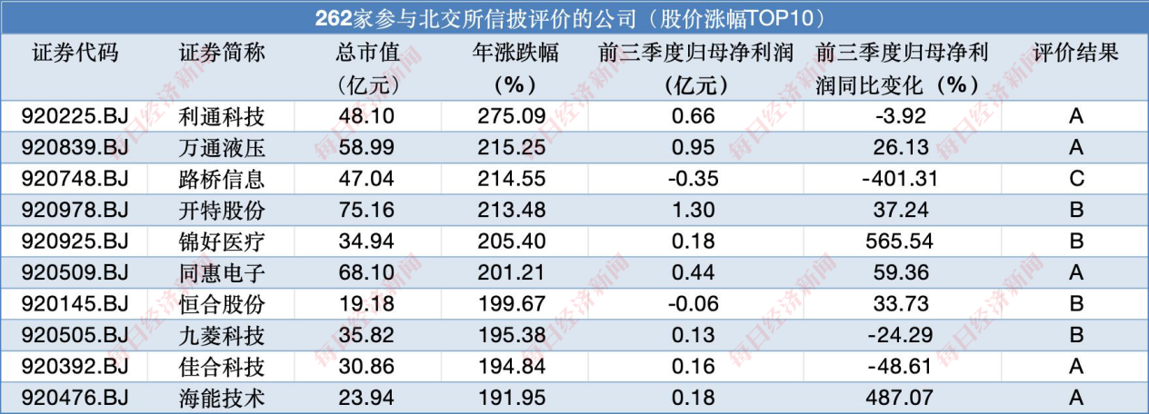 《每日经济新闻》记者根据Wind数据统计了此次参评的262家北交所公司发现,市值TOP10中,有5家获评A,5家获评B。