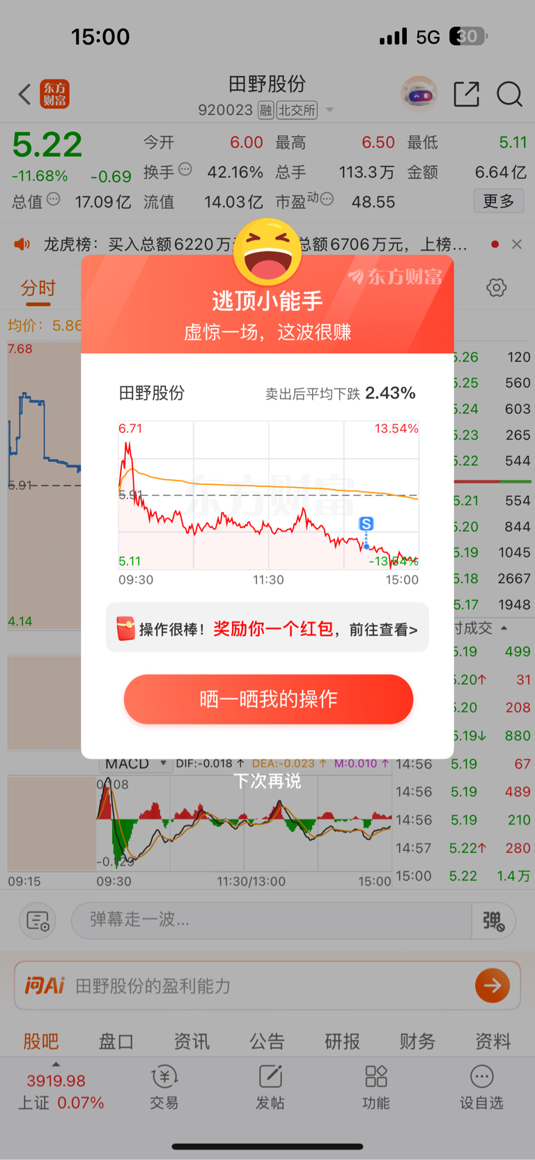 $田野股份(SZ920023)$ 小挣离场