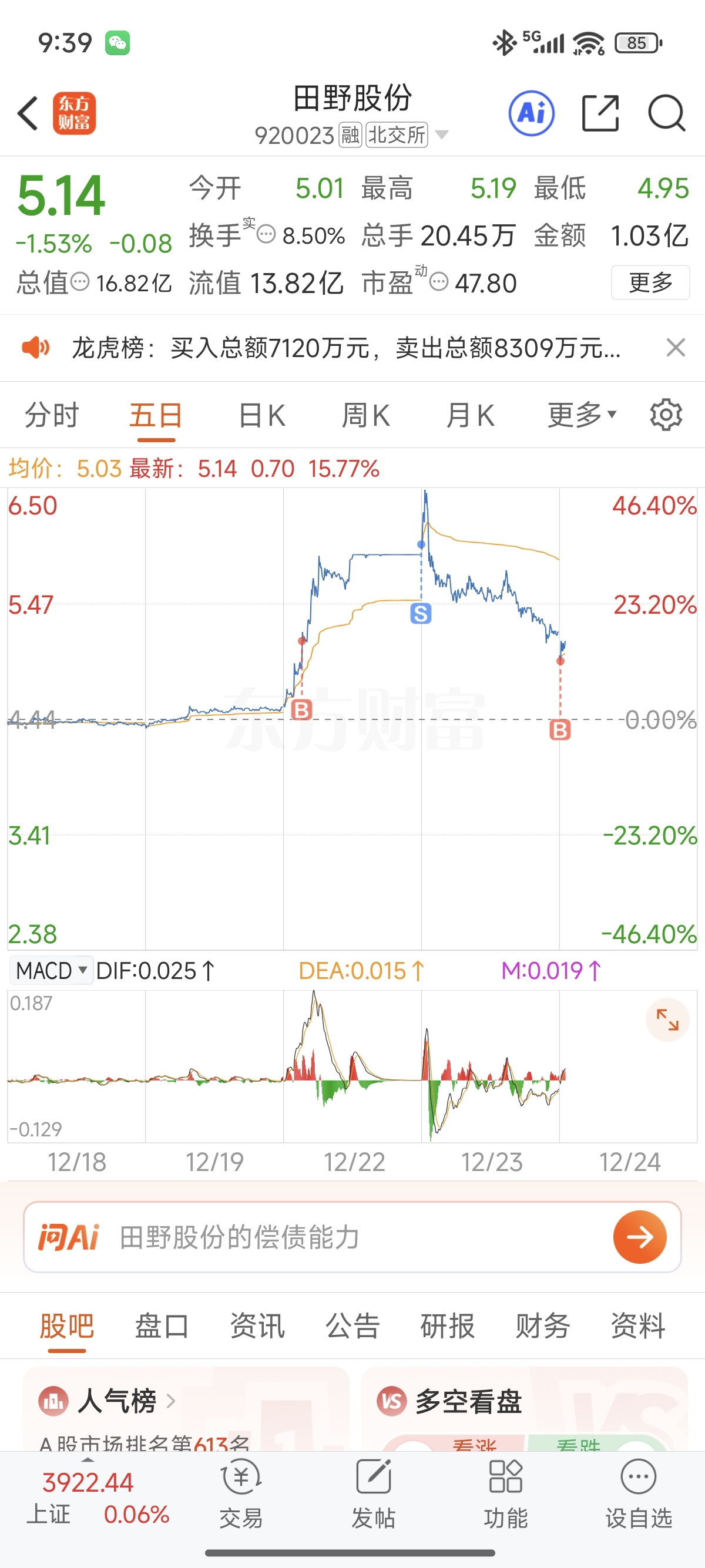 $田野股份(SZ920023)$ 4.96接回来了,坐等拉10个点以上