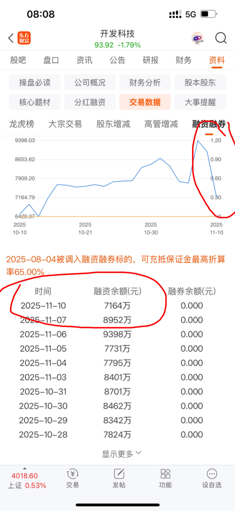 $开发科技(SZ920029)$ 昨天跑的是融资盘