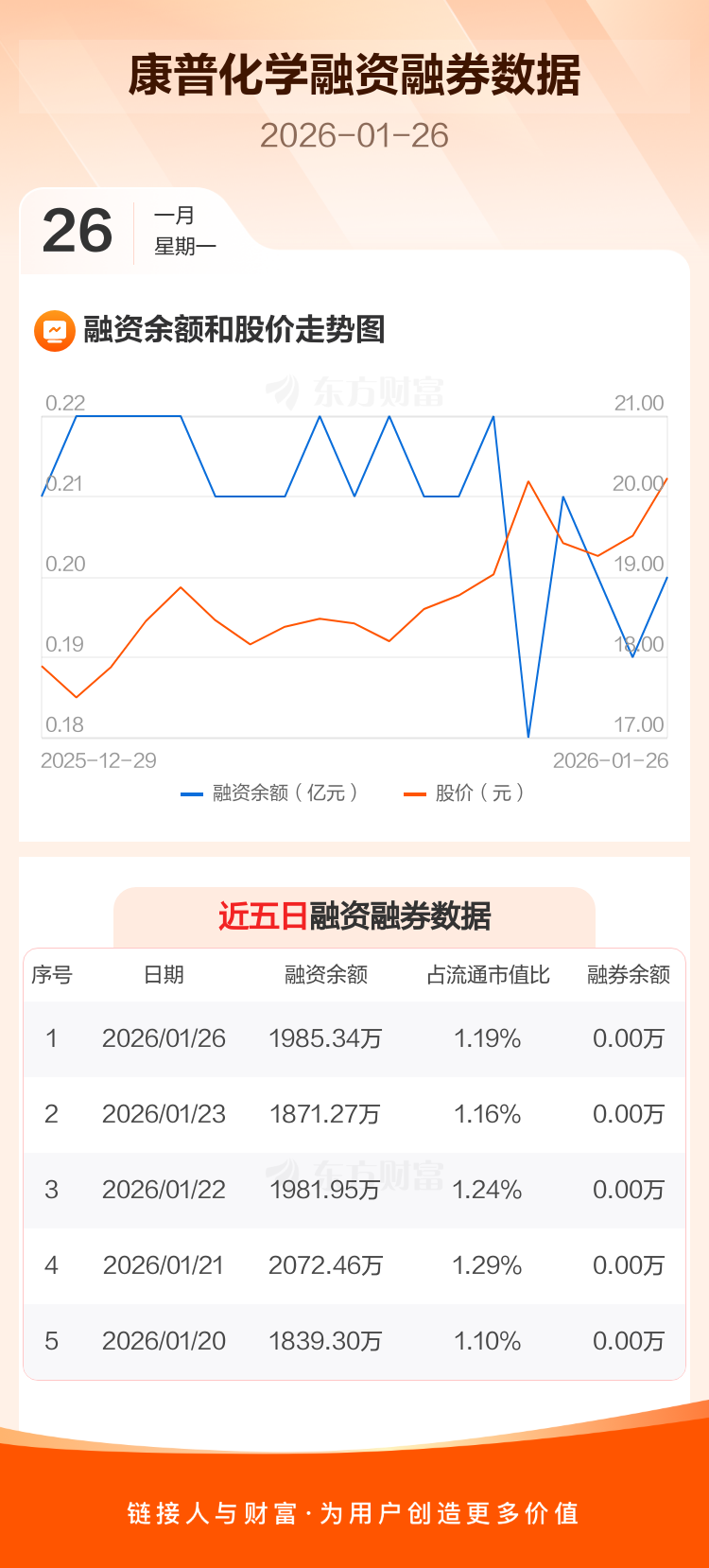交易所最新数据显示,康普化学于2026年1月26日获融资买入344.27万元,融资偿还230.21万元,当日融资净买入114.07万元。目前,该股融资余额1985.34万,占流通市值比例为1.19%。