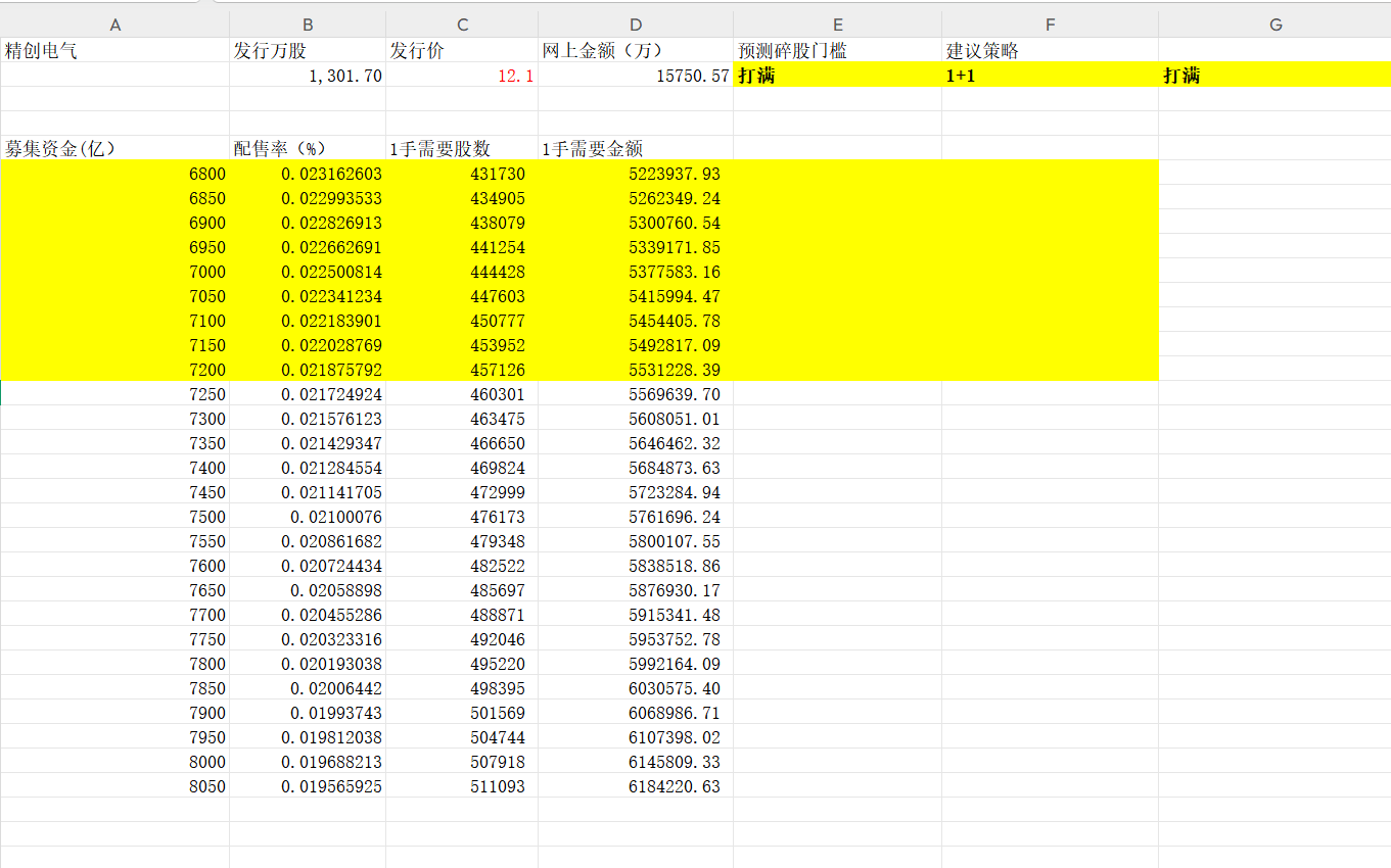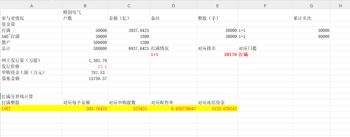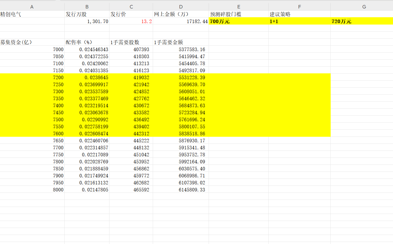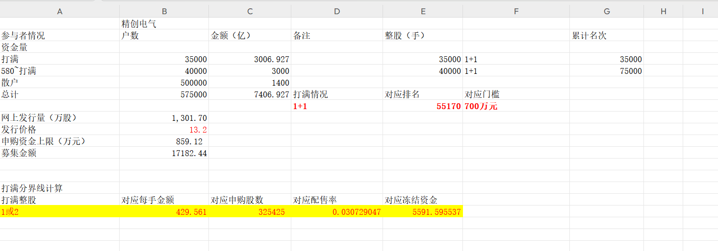 目前拿到注册批文的只剩下了精创电气,不需要预测下一个是谁了。但是考虑到目前新股允许少量超募,所以发行价不好确定,这里姑且按照13.20元来计算吧,毕竟往下不可能低于12.10元,网上也不会超额募集很多。