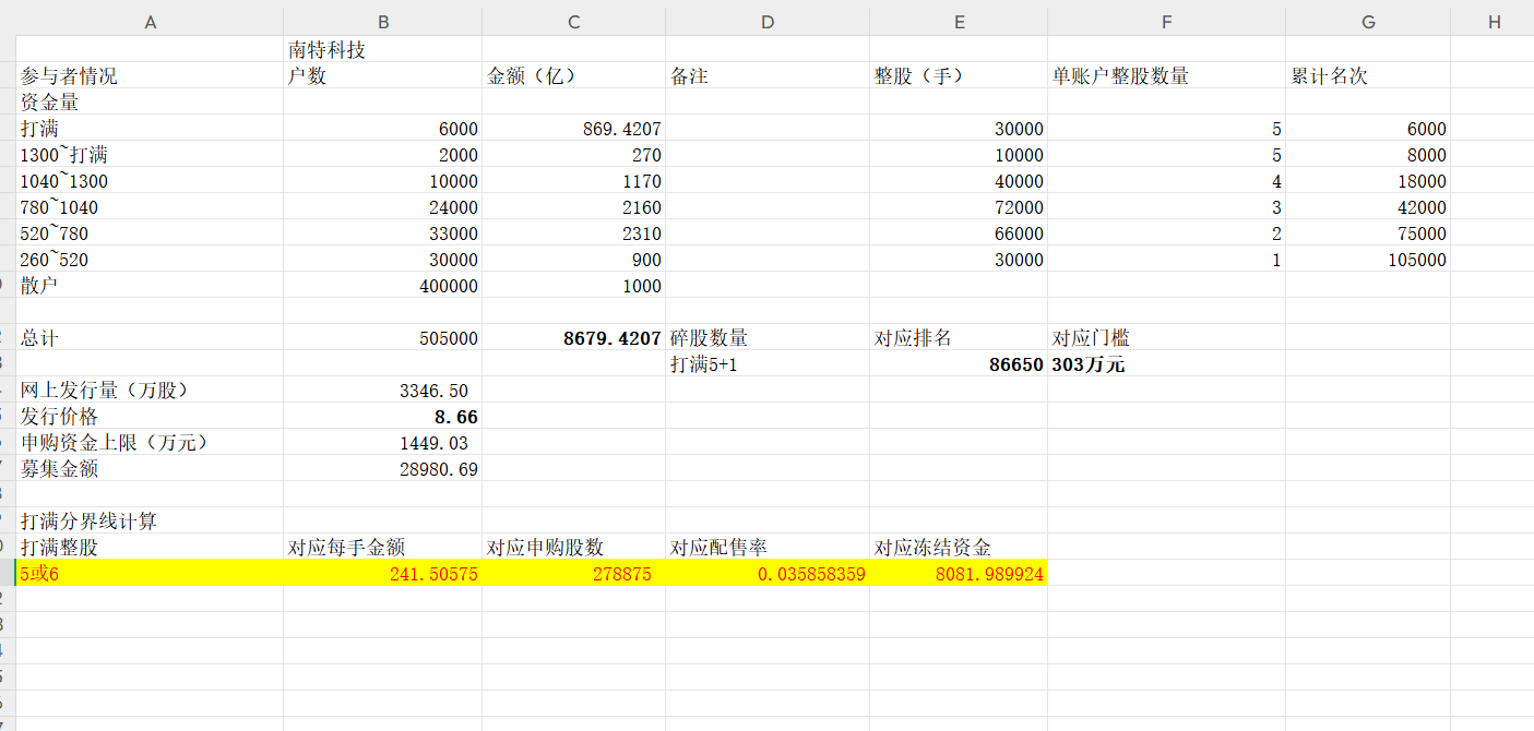 我之前给了一个8200亿元的中值,推荐资金给了8400亿,求稳甚至给到了8650亿,也就是258万元/手,没想到竟然翻车了。其实给的不管是中值的8200亿,还是求问的8650亿,已经算是很高的了,但是这次真的非常出乎意料。正如同之前的科力股份,科拜尔,科隆新材三次最大的翻车事件,碎股本轮又是格外的低。我周围的基本上1/3的账户,是属于翻车/打满,按照10.5万人配售,那么这里就是3.5万人,之前预测660万元/6万整的碎股人数,目前来看就是要9.5万户了。当然了后来盲测,感觉可能我周围翻车多是因为大家都在凑250万元的倍数,很多不懂的人都是乱打,翻车比例没有那么高。回撤碎股大概在8.7万户。
