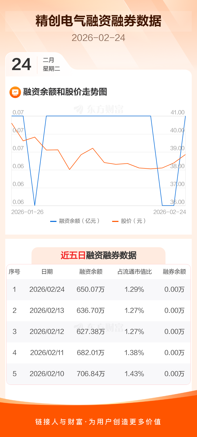 交易所最新数据显示,精创电气于2026年2月24日获融资买入43.84万元,融资偿还30.47万元,当日融资净买入13.37万元。目前,该股融资余额650.07万,占流通市值比例为1.29%。