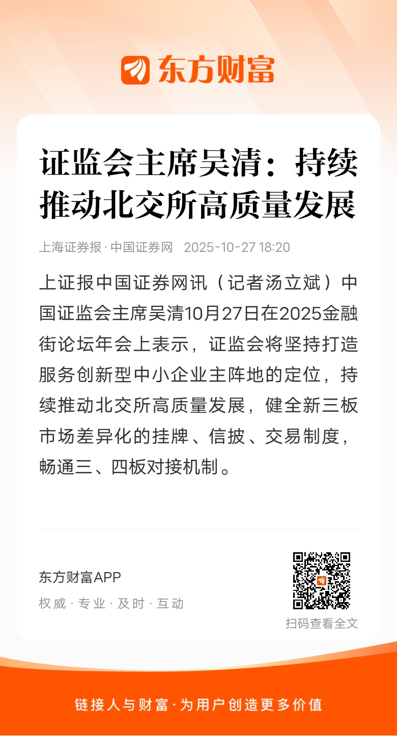 上证报中国证券网讯(记者汤立斌)中国证监会主席吴清10月27日在2025金融街论坛年会上表示,证监会将坚持打造服务创新型中小企业主阵地的定位,持续推动北交所高质量发展,健全新三板市场差异化的挂牌、信披、交易制度,畅通三、四板对接机制。