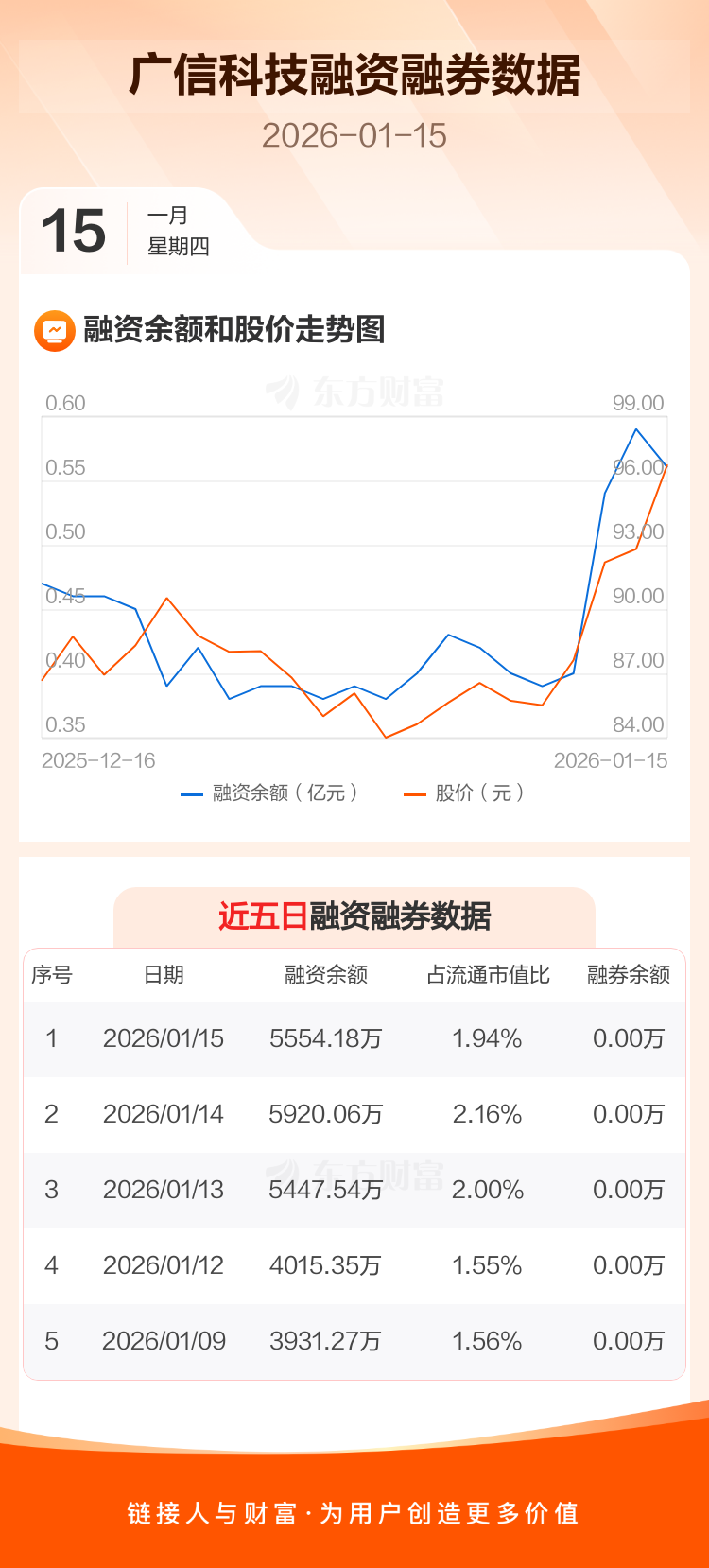 交易所最新数据显示,广信科技于2026年1月15日获融资买入691.18万元,融资偿还1057.06万元,当日融资净偿还365.88万元。目前,该股融资余额5554.18万,占流通市值比例为1.94%。