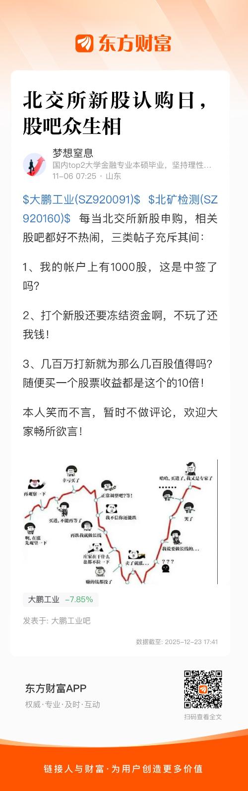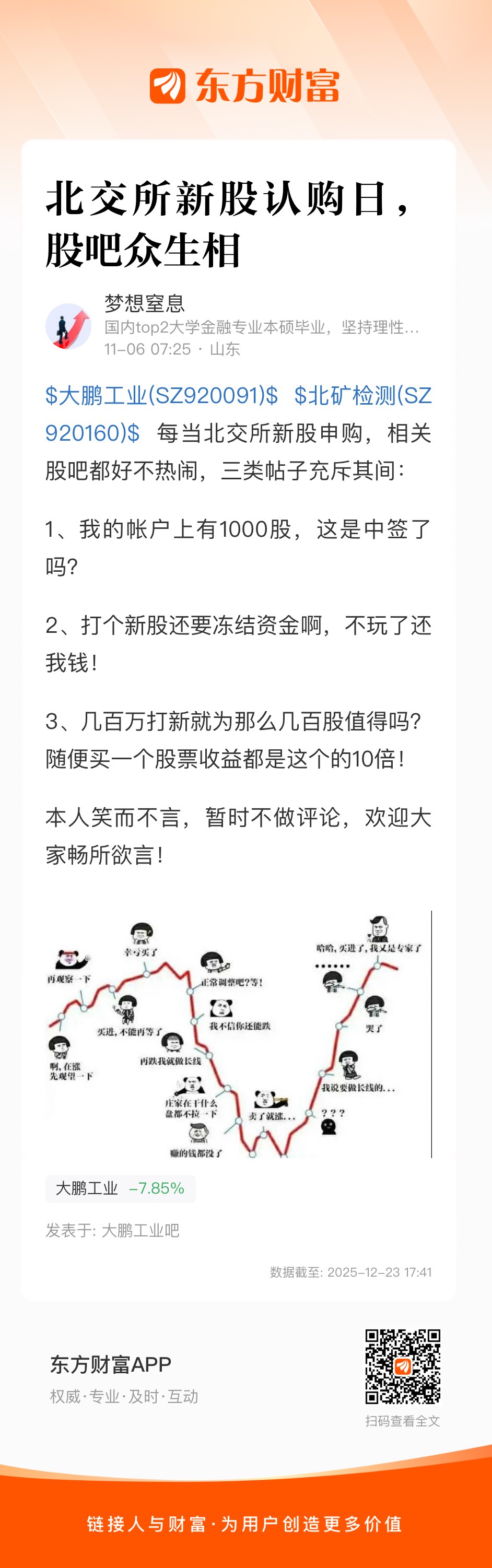 $大鹏工业(SZ920091)$ $北矿检测(SZ920160)$ 每当北交所新股申购,相关股吧都好不热闹,三类帖子充斥其间: