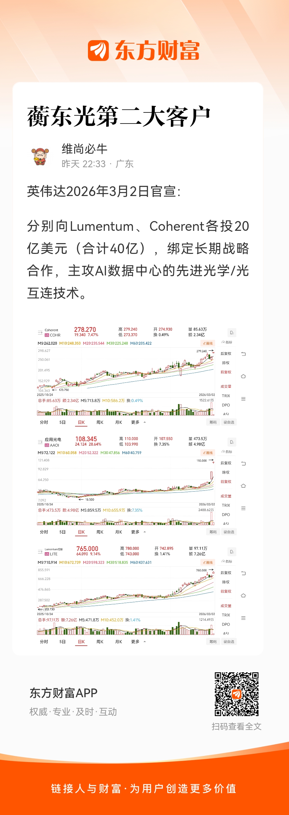 分别向Lumentum、Coherent各投20亿美元(合计40亿),绑定长期战略合作,主攻AI数据中心的先进光学/光互连技术。