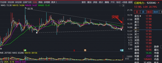 今日强势上涨,突破了调整了长达10个月的收敛三角形,上方压力位看20.96附近。短期防守位看16.55。当前位置上如果能保持横向震荡或者震荡上行就问题不大,否则跌破防守位应降低仓位。今日大涨后,乖离率大,有随时回调的风险,不建议直接追高建仓。