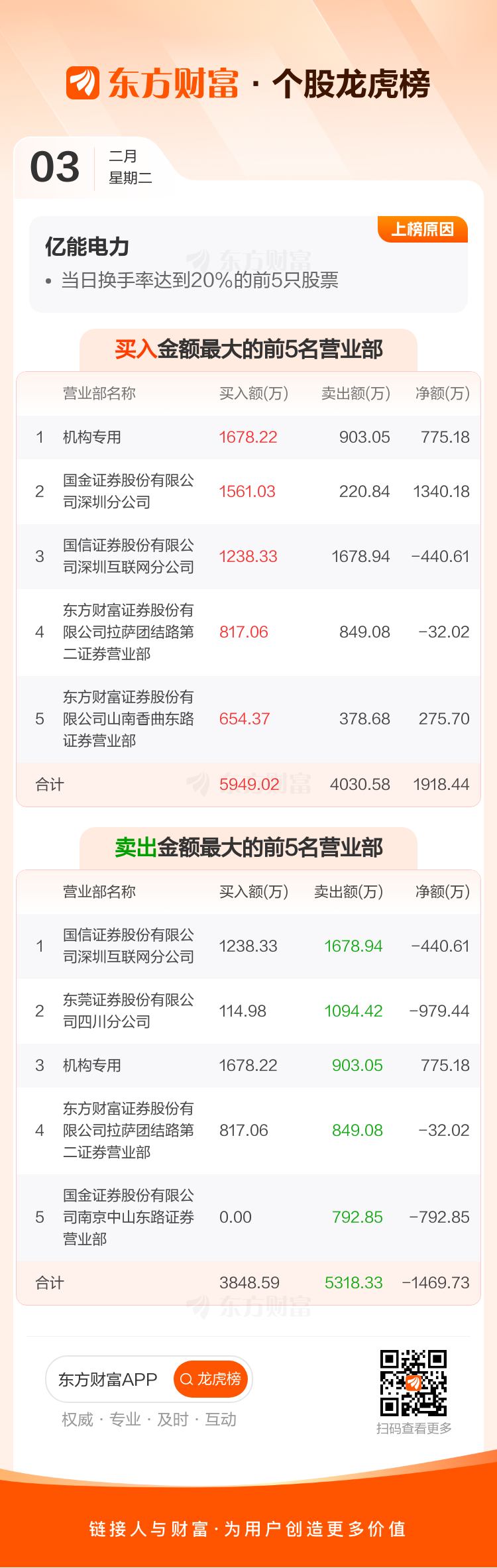 交易所2026年2月3日公布的交易公开信息显示,亿能电力因成为当日换手率达到20%的前5只股票上榜。亿能电力当日收报29.59元,涨跌幅1.51%,偏离值32.81%,换手率28.64%,成交额5.26亿。