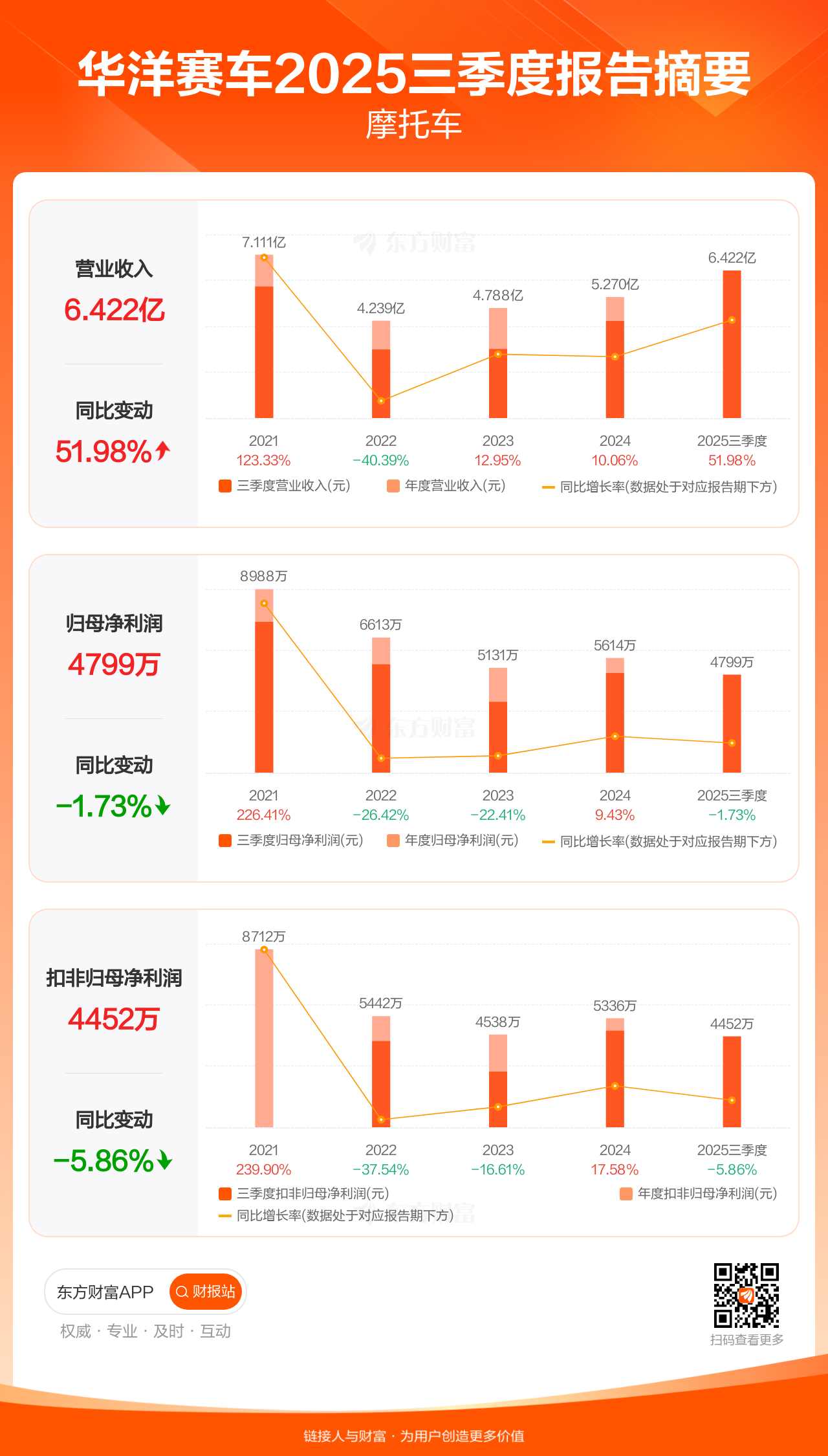 华洋赛车10月28日发布2025年三季报显示,公司前三季实现营业收入6.42亿元,同比增长51.98%;归母净利润4798.92万元,同比下滑1.73%;扣非归母净利润4451.63万元,同比下滑5.86%。