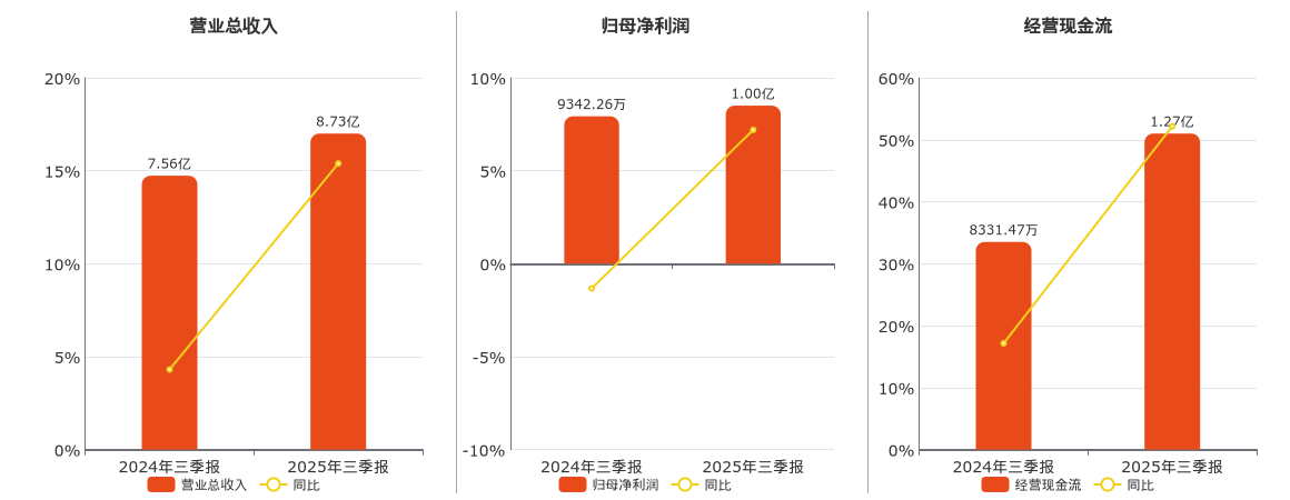 公司营业总收入为8.73亿元。归母净利润为1.00亿元。经营活动现金净流入为1.27亿元。