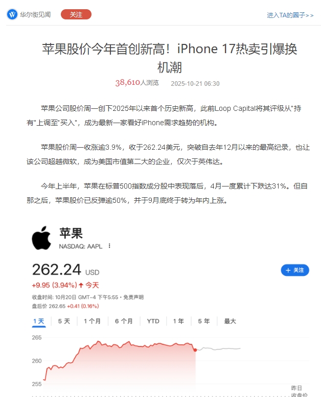 苹果股价创历史新高!iPhone17开售即爆卖,中美销量同比增长14%。这不仅是
