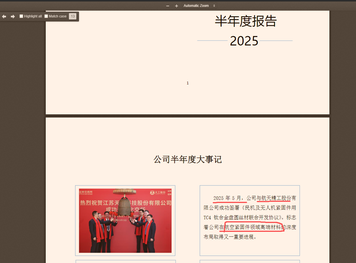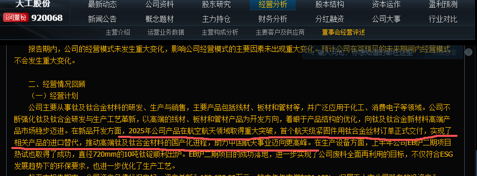 公司半年报明确说了航天级用钛合金丝材订单正式交付。