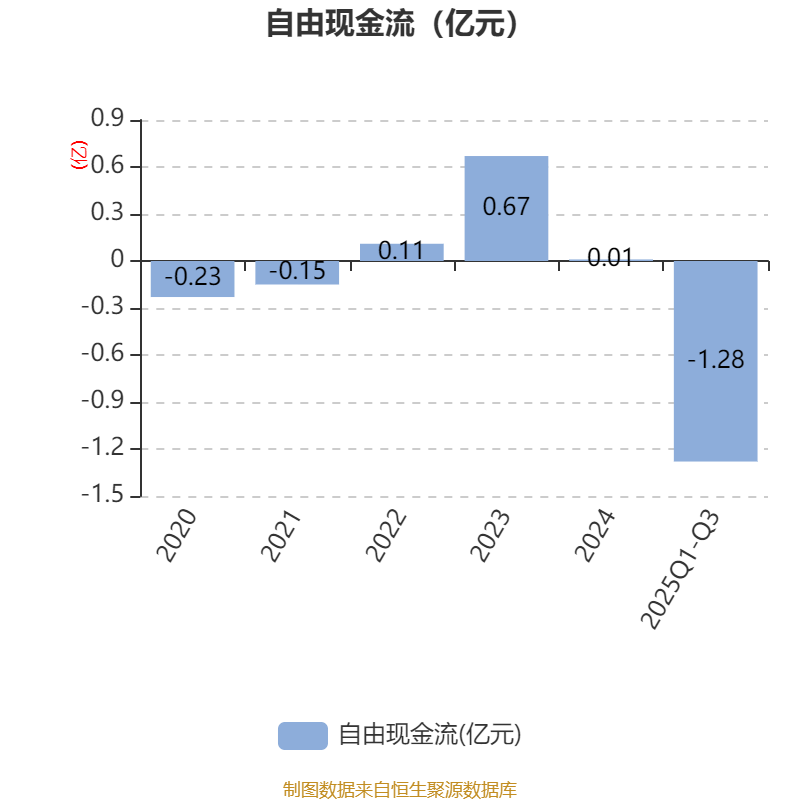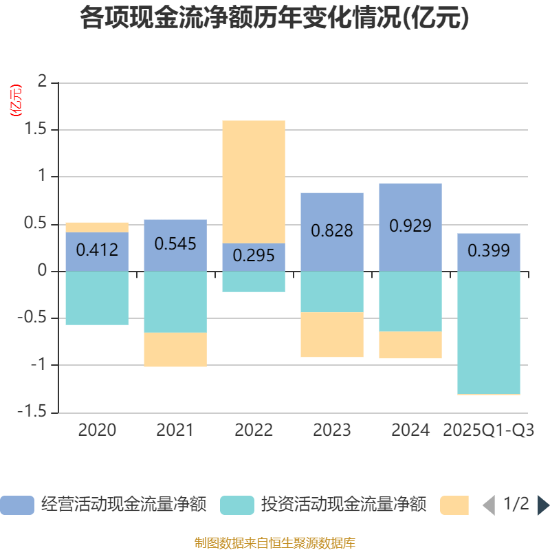 2025年前三季度,公司经营活动现金流净额为3990.09万元,同比下降20.73%;筹资活动现金流净额-109.83万元,同比增加2046.83万元;投资活动现金流净额-1.3亿元,上年同期为-1.6亿元。