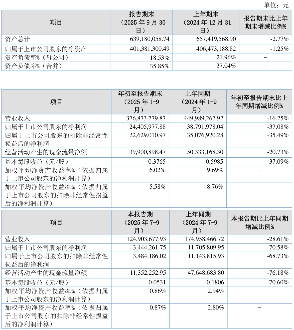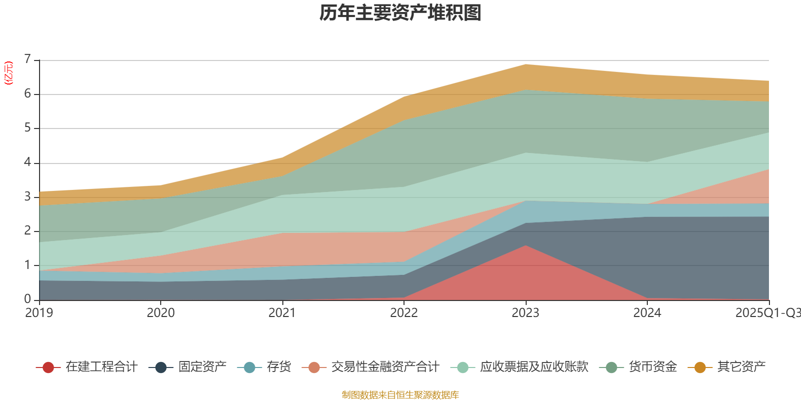 资产重大变化方面,截至2025年三季度末,公司交易性金融资产合计占公司总资产的15.67%,上年末为0;货币资金较上年末减少50.79%,占公司总资产比重下降13.85个百分点;应收票据及应收账款较上年末减少12.8%,占公司总资产比重下降1.92个百分点;固定资产较上年末增加1.8%,占公司总资产比重上升1.7个百分点。