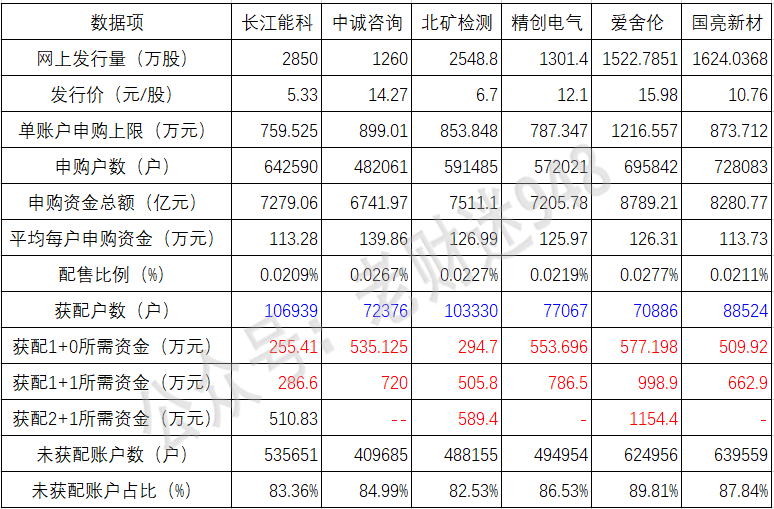 根据公告数据的计算和相关信息,国亮新材网上申购总户数728083户,申购资金总额8280.77亿元,配售比例0.0211%,最终获配户数88524户,按比例每获配一手“正股”需申购509.916万元(申购47.39万股),获配碎股的门槛大约在662.9万元(申购61.61万股)左右(未获得特别精确数据),未获得配售的账户(陪跑账户)数量为639559户,占申购总户数的比例87.84%。