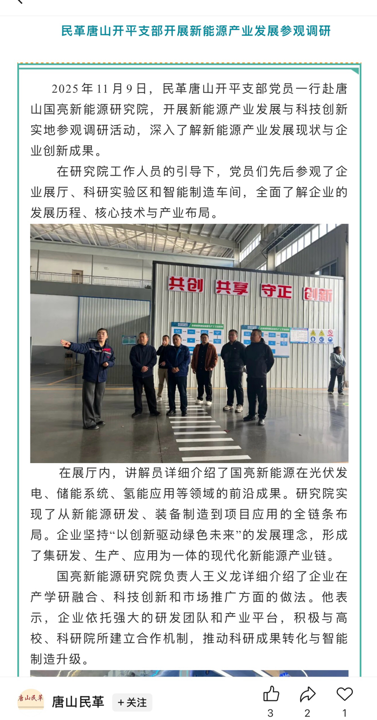 2025年11月9日,民革唐山考察国亮新能源研究院,国亮新能源在“光伏发电、储能