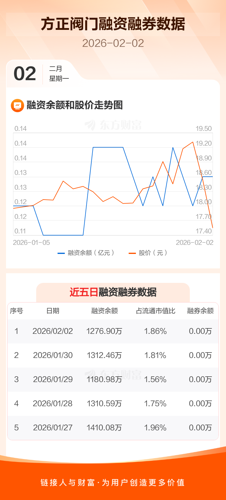 交易所最新数据显示,方正阀门于2026年2月2日获融资买入150.57万元,融资偿还186.13万元,当日融资净偿还35.56万元。目前,该股融资余额1276.90万,占流通市值比例为1.86%。