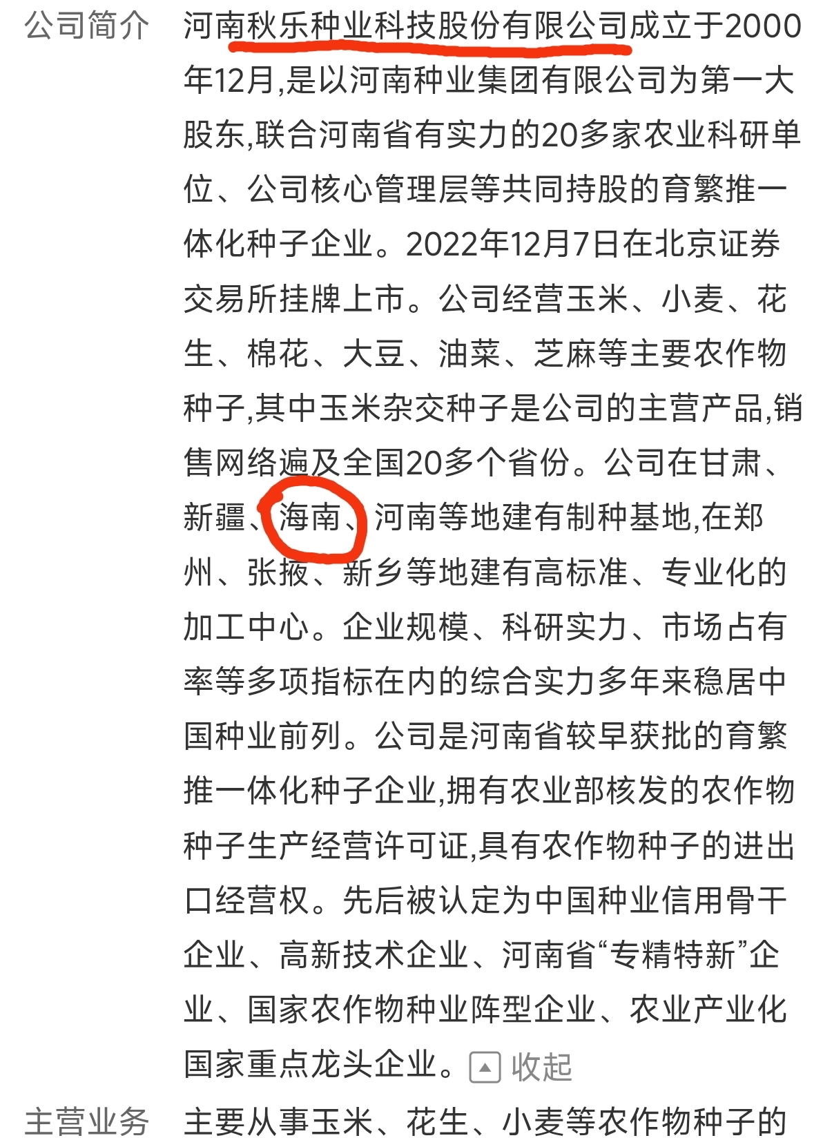 $秋乐种业(SZ920087)$ 秋乐种业公司董事长在大会上发言,确认消息:秋乐种业在海南有全资子公司,在海南南繁、海南崖城均有种植基地!$敦煌种业(SH600354)$