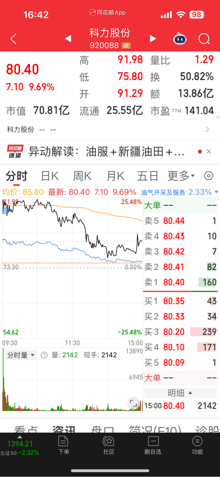 $科力股份(SZ920088)$ 这个帖子我准备上午发的,怕搞兄弟们心态,走成这样,我是不开心的,因为我怎么的都想到今天涨停明天溢价,给里面的兄弟打打气,。都发财。我卖出的理由是,1,我是单钓,2,,内资尿性,.3,买了原油板块个股,周六周日,压根就没有睡的琢磨,人都神经了。不想折磨自己,所以,小赚一点,被套的,大赚的兄弟们,都分享一下,少点戾气,多点友好,沟通一下